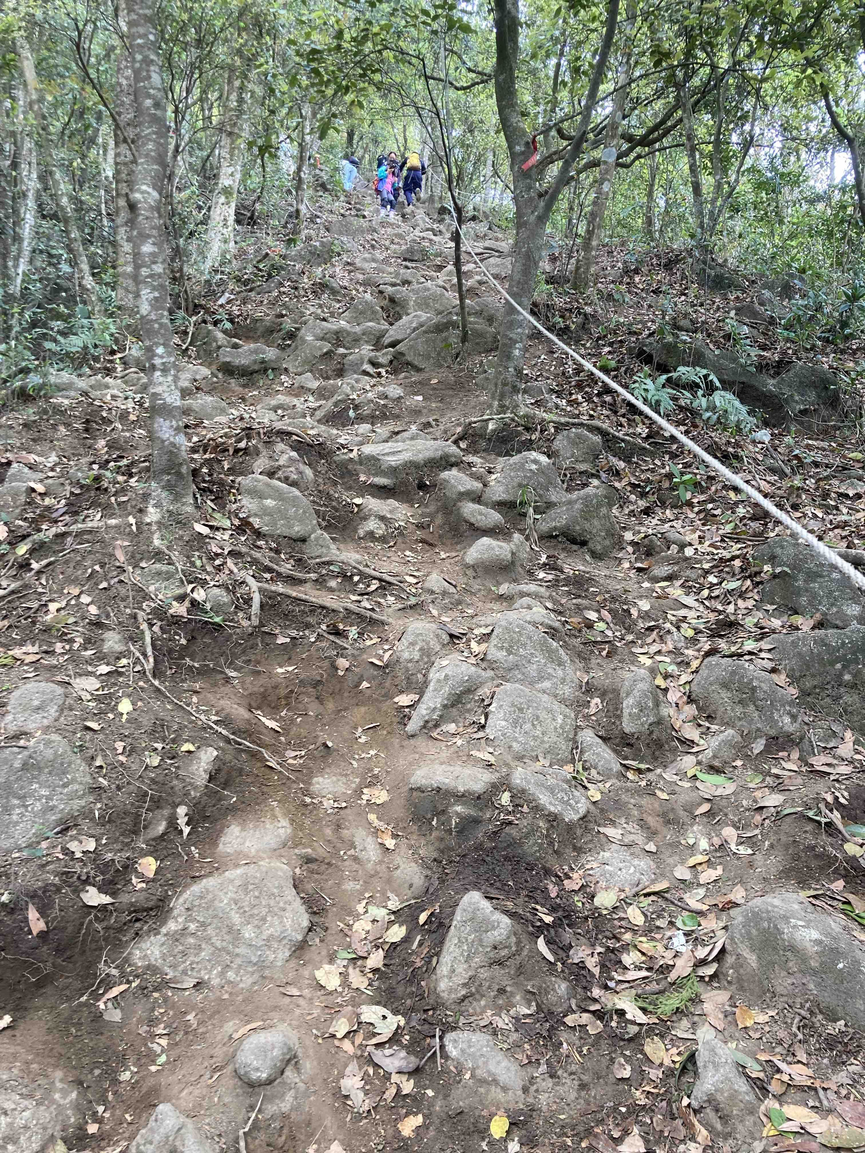 此后路况都为泥土夹杂乱石,坡度加大到45度,出现很长的助力路绳,几乎这样一坡到顶