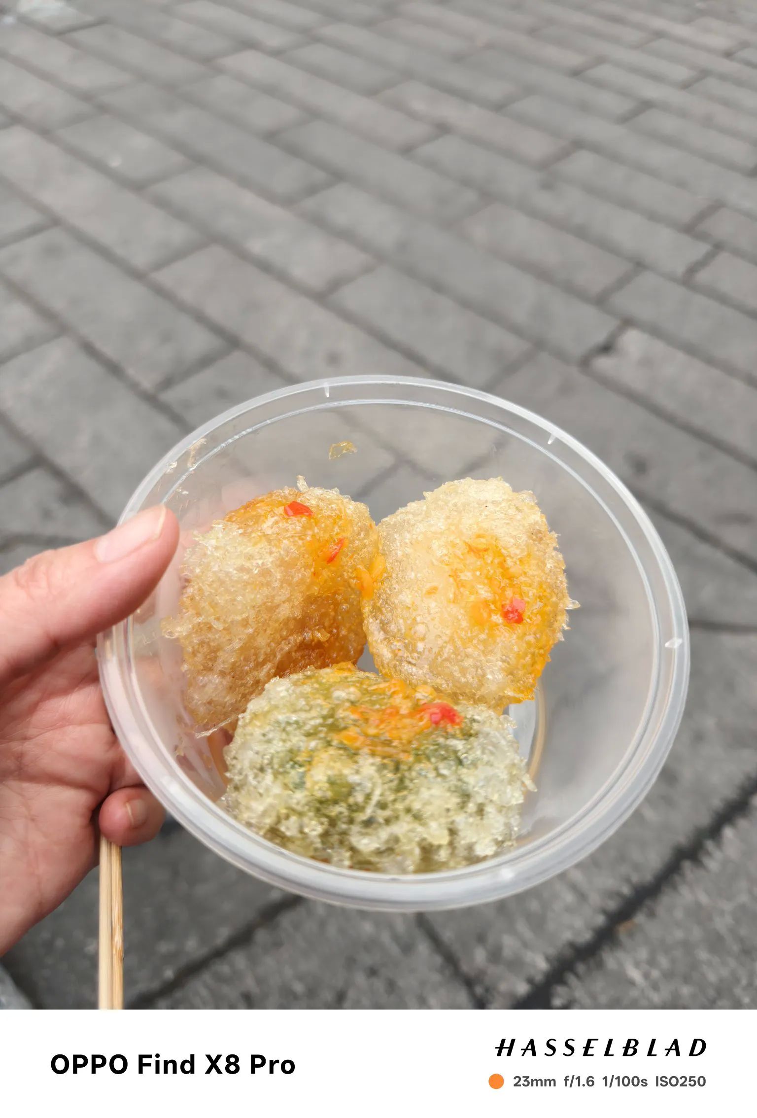 在中山路老街口看到了酵粿桃,很好奇就试了试,和老板商量一下,要了三个咸的(一个韭菜两个花生),二个甜的,凑个十块钱。味道出奇好,口感和味道俱佳。用木薯粉做的皮,糯糯的肉肉的,韭菜味道鲜美。特别推荐尝一下。