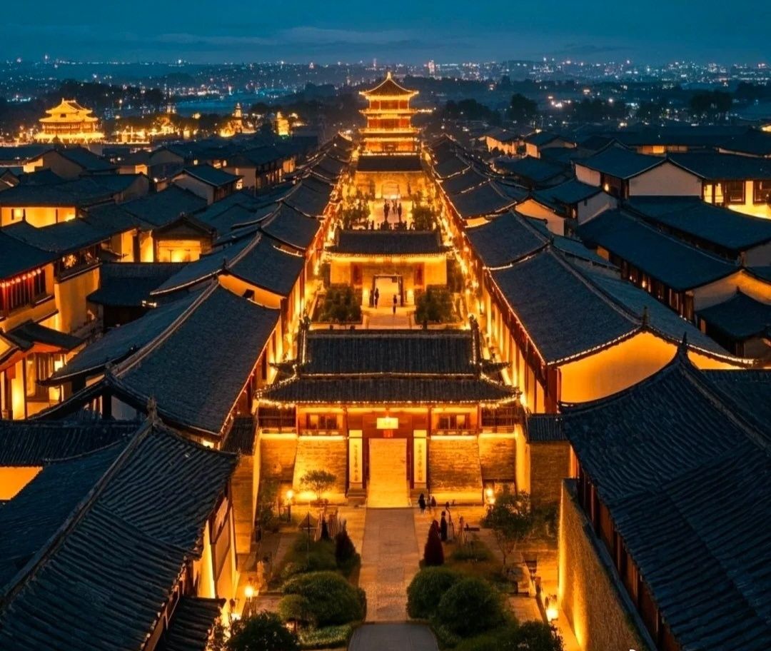 以三国文化为核心,古城内建筑古色古香,连廊、骑楼、斗拱飞檐尽显1800年前魏都的恢宏。漫步其中,能看到不少还原三国场景的装饰和雕塑,仿佛瞬间穿越回那个英雄辈出的年代。夜晚还有各种特色小店和小吃摊,热闹非凡。