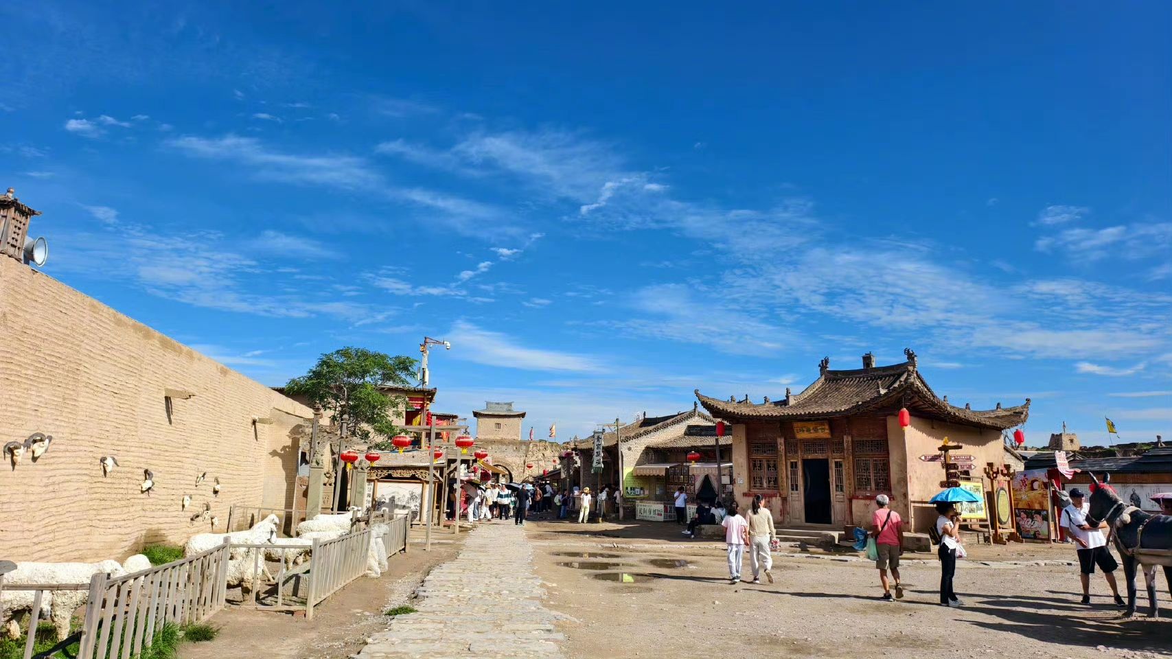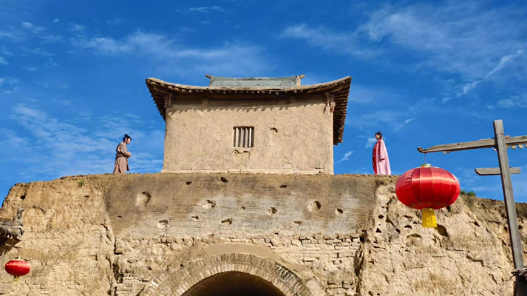 一进城门,就像跌进了一场粗粝的西北旧梦。土坯房、破酒馆、镖局、马厩……全是几十年前大西北的真实样貌。你可以租一套至尊宝的衣服、抱一把假宝剑,在城墙下摆一段中二造型;或者披上红姑的粗布衣,蹲在《红高粱》的酿酒坊前拍一张“咱就是这片地上最烈的妞”。