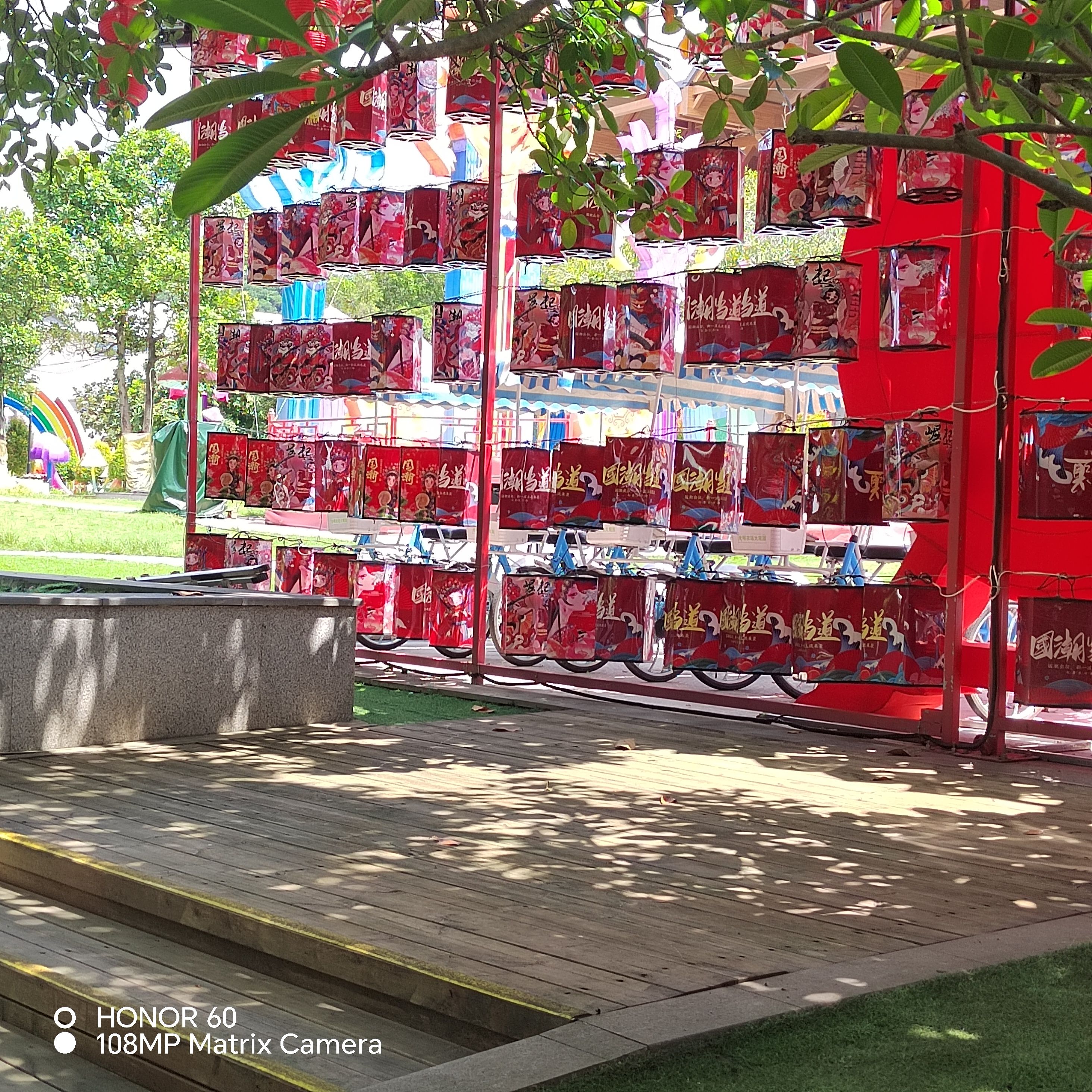许多路边的布景,是一些人工制作的假花假草,还有一些造型奇特的假蘑菇,到处都是一片假象,孤独的海盗船安静的停靠在那里。旋转木马播放着音乐,有几个小朋友欢快的在上面转圈圈。