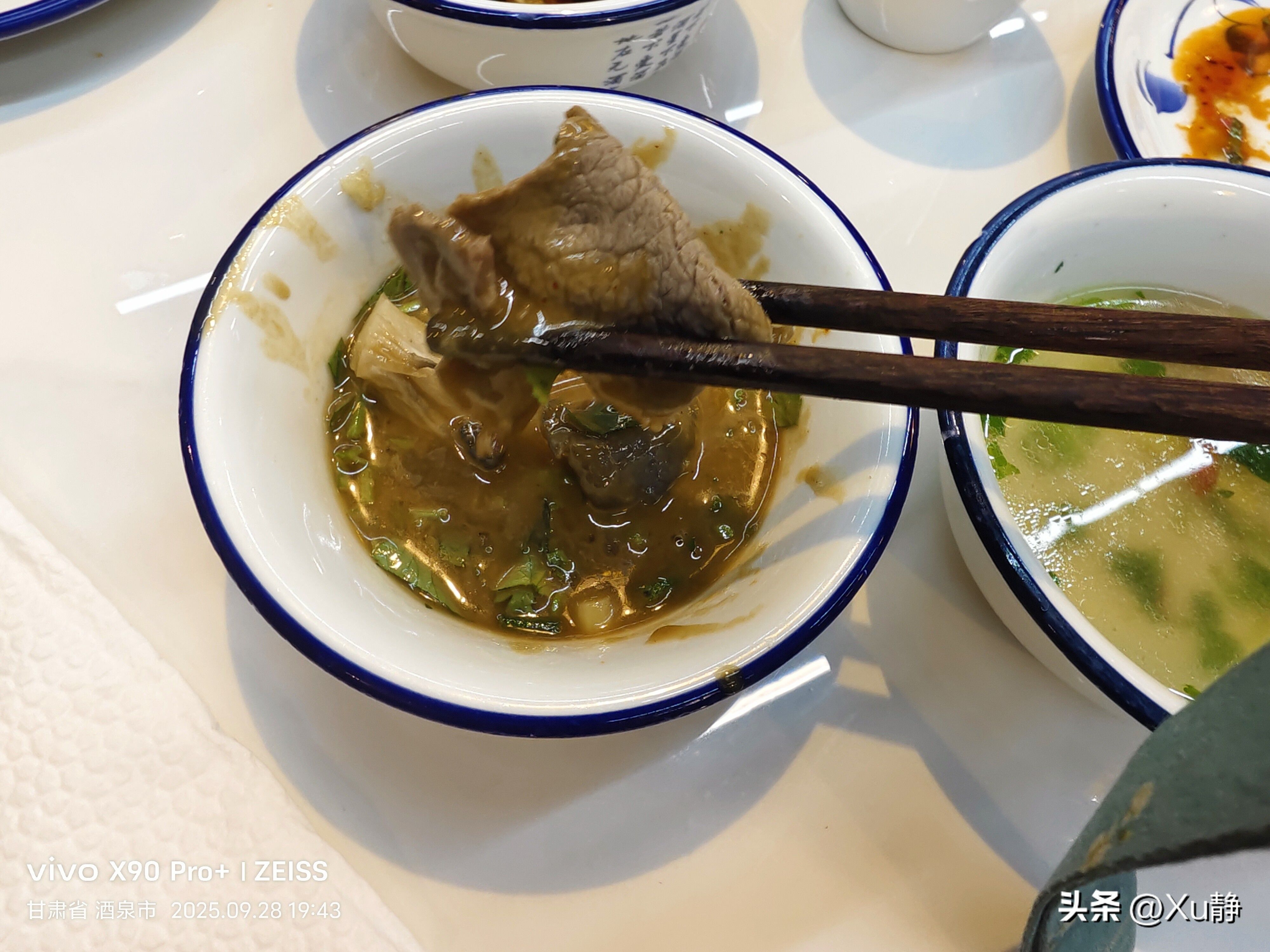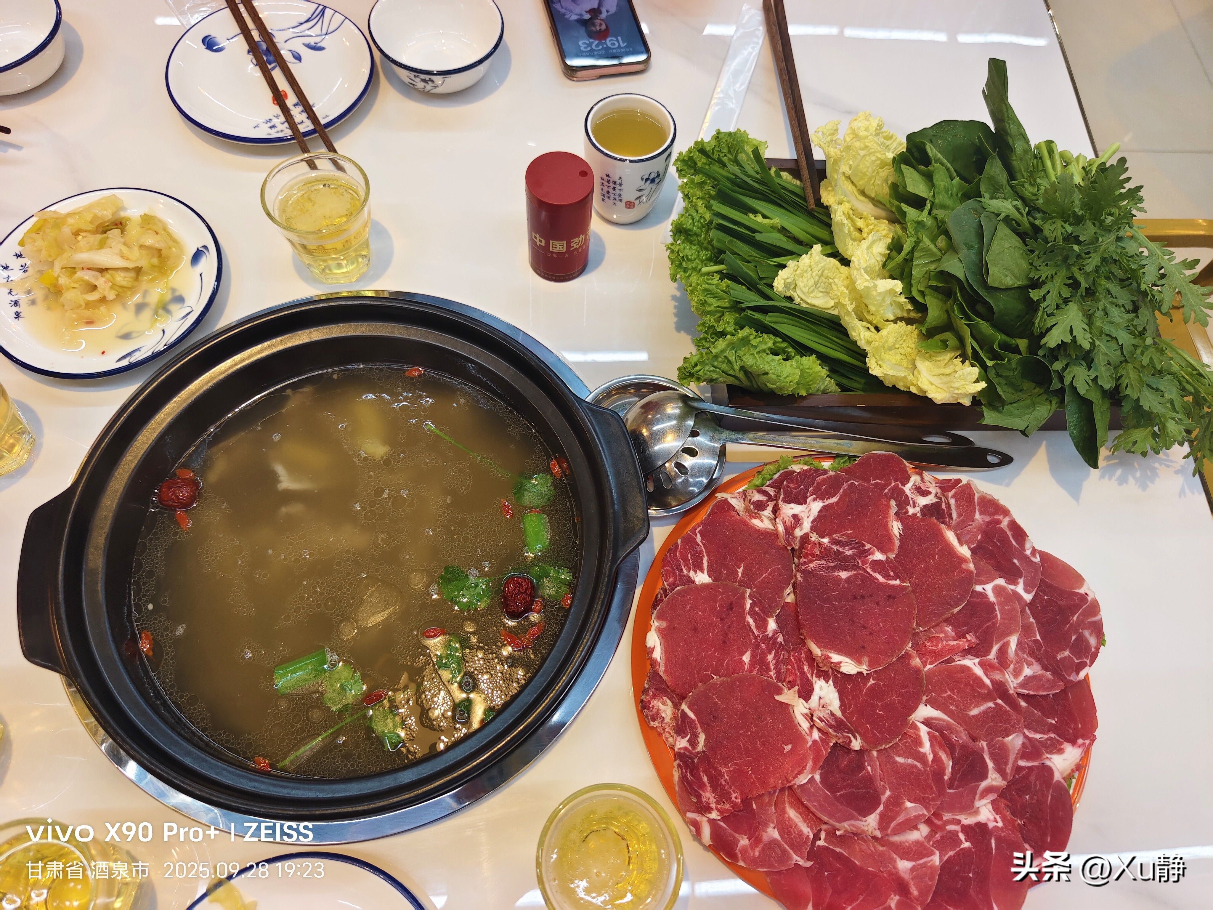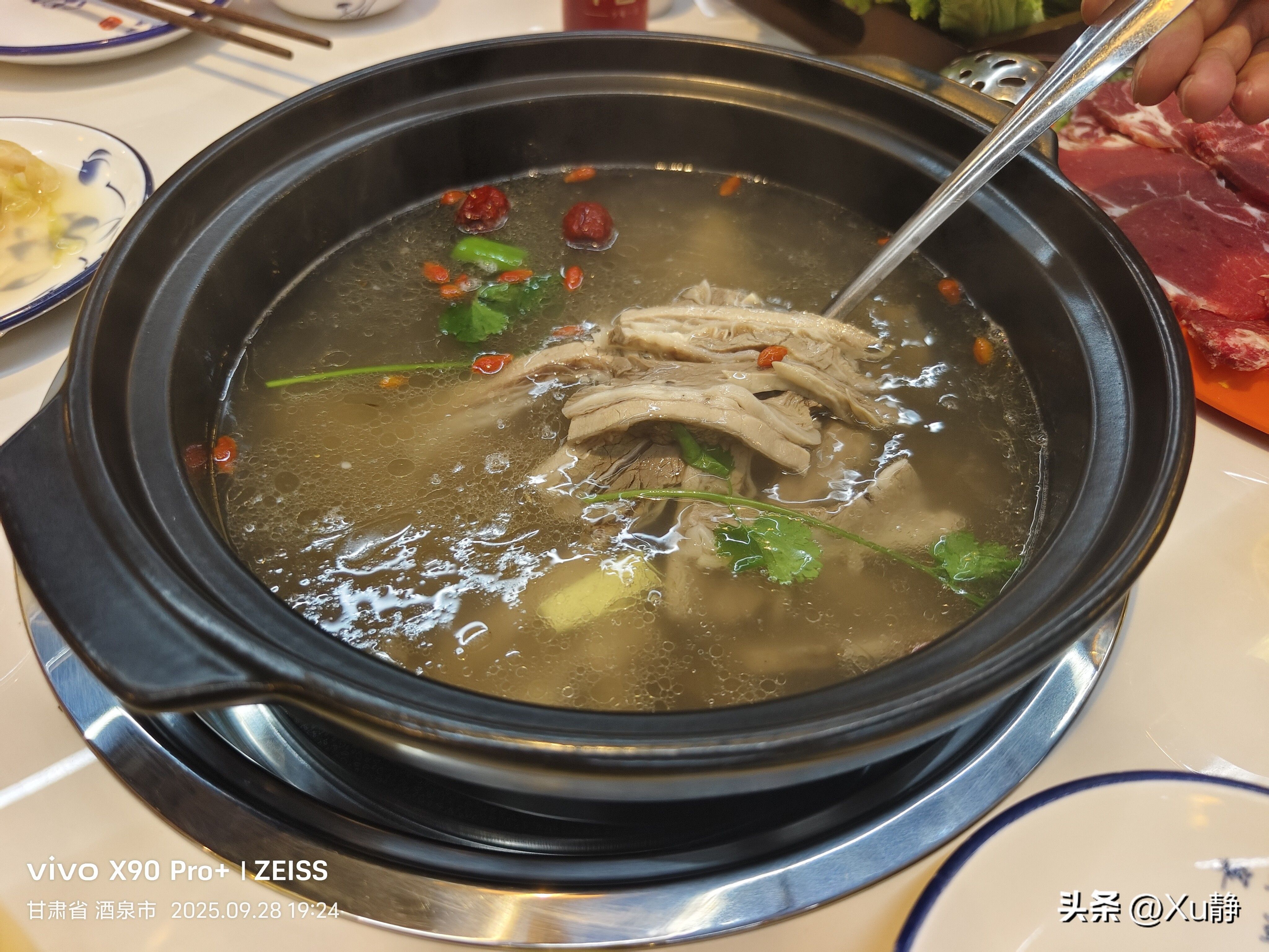 9月28日,从金塔胡杨林景区,坐大巴前往目的地酒泉,走连霍高速,6点30分到酒泉肃州区天喜大酒店,放行李,出来找吃晚饭的饭店,问了当地人,说拐角处的一家牛肉火锅挺好吃,过去看门头是翘脚牛肉汤锅,还纳闷翘脚牛肉不是四川乐山的美食吗,听老板娘介绍说是去四川学的翘脚牛肉的做法,开了店后,当地人不接受,经过改良适应当地口味,演变成现在的养生锅,分了几种口味,老板娘说,要是相信她,就按她给推荐的吃,我们就按她推荐的上的菜,锅底是用当地的黄牛牛腩肉和牛骨煮的汤,锅开后,先喝汤吃牛肉,汤鲜,牛肉肉质紧实,软烂鲜香,吃了锅底的牛肉,又开始涮牛肉和羊肉,大片的牛羊肉,沾了沾料,满口流香,这顿火锅吃的很满足,老板娘还送了一盘牛肉韭菜水饺。