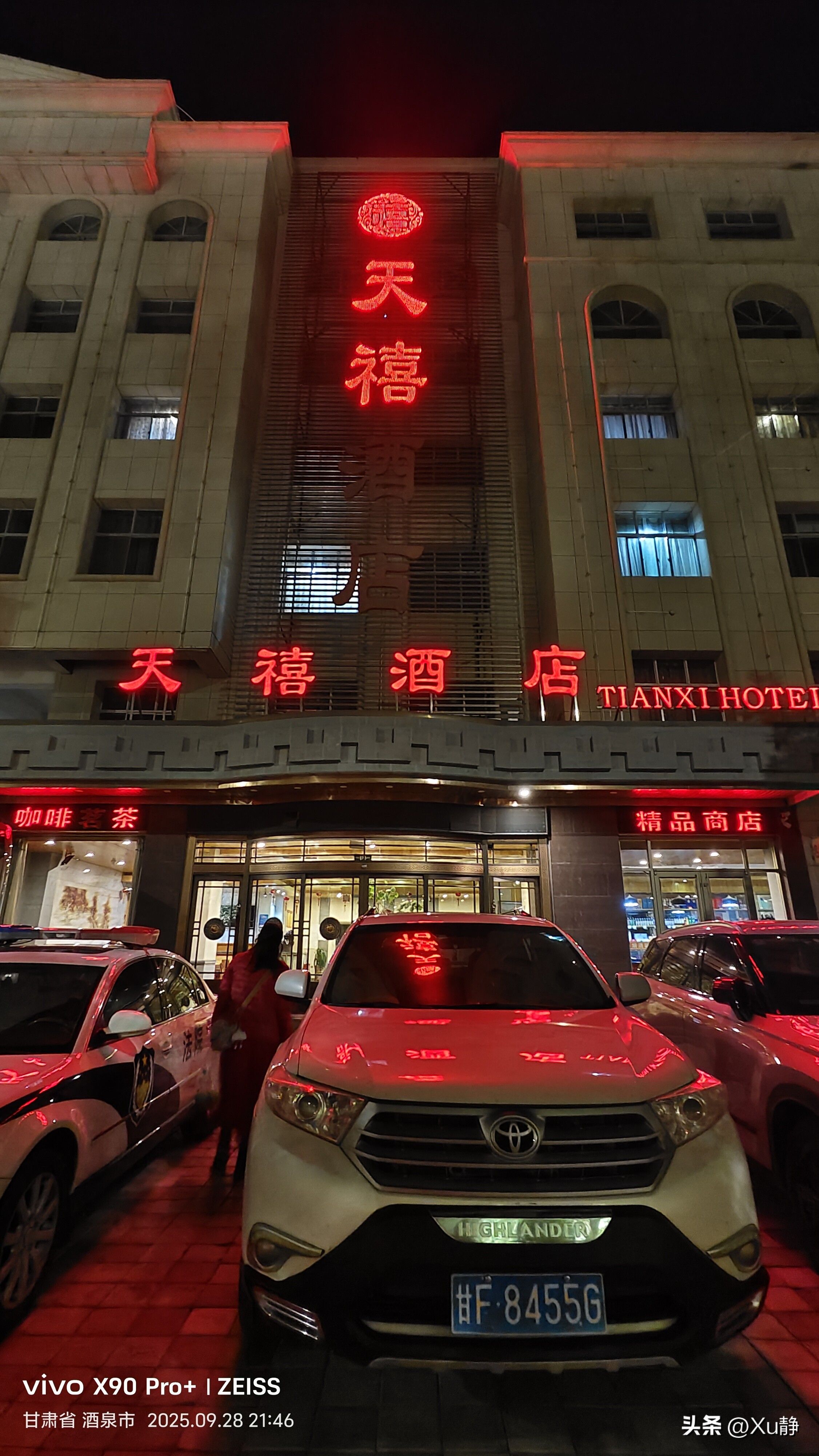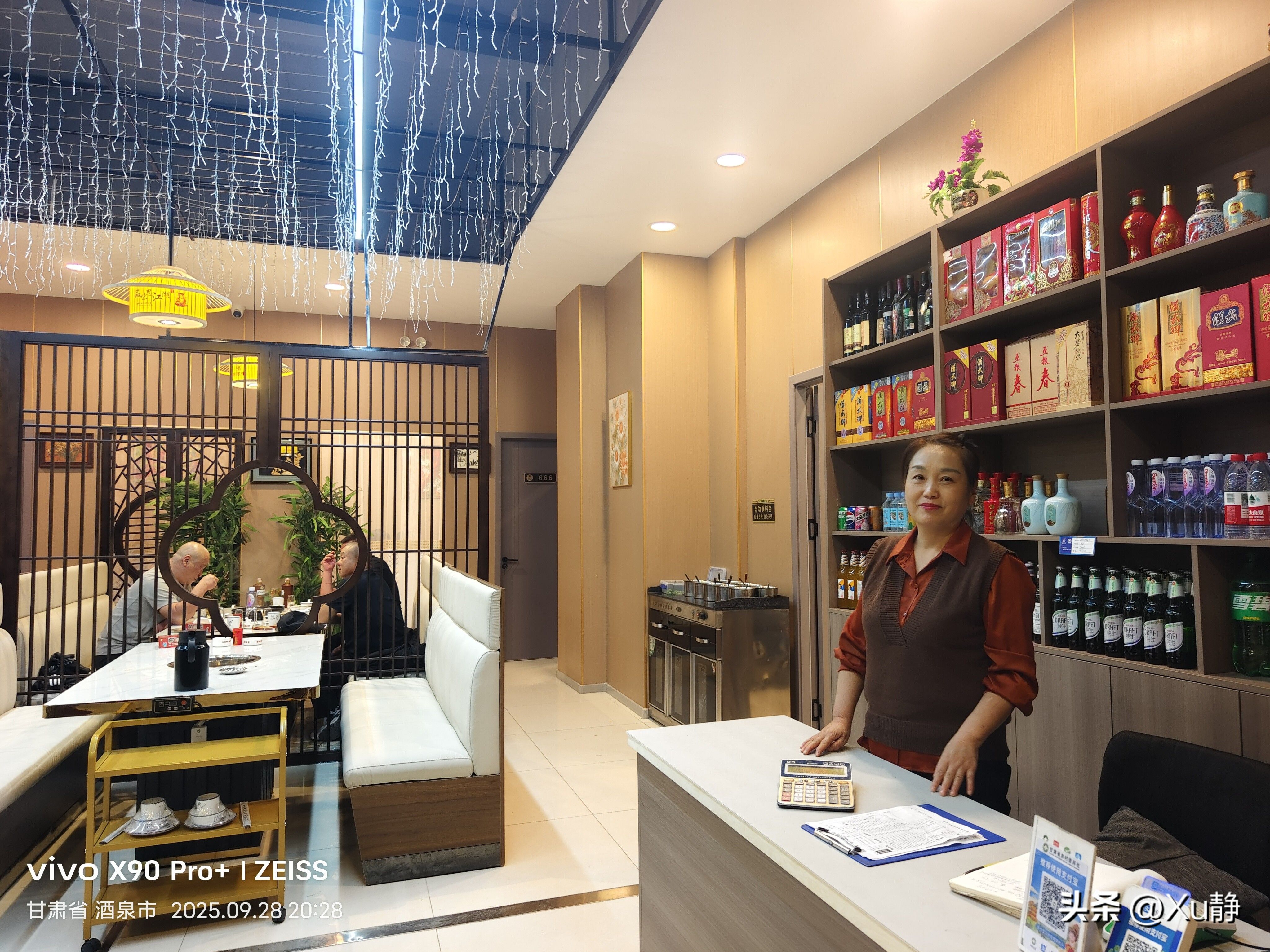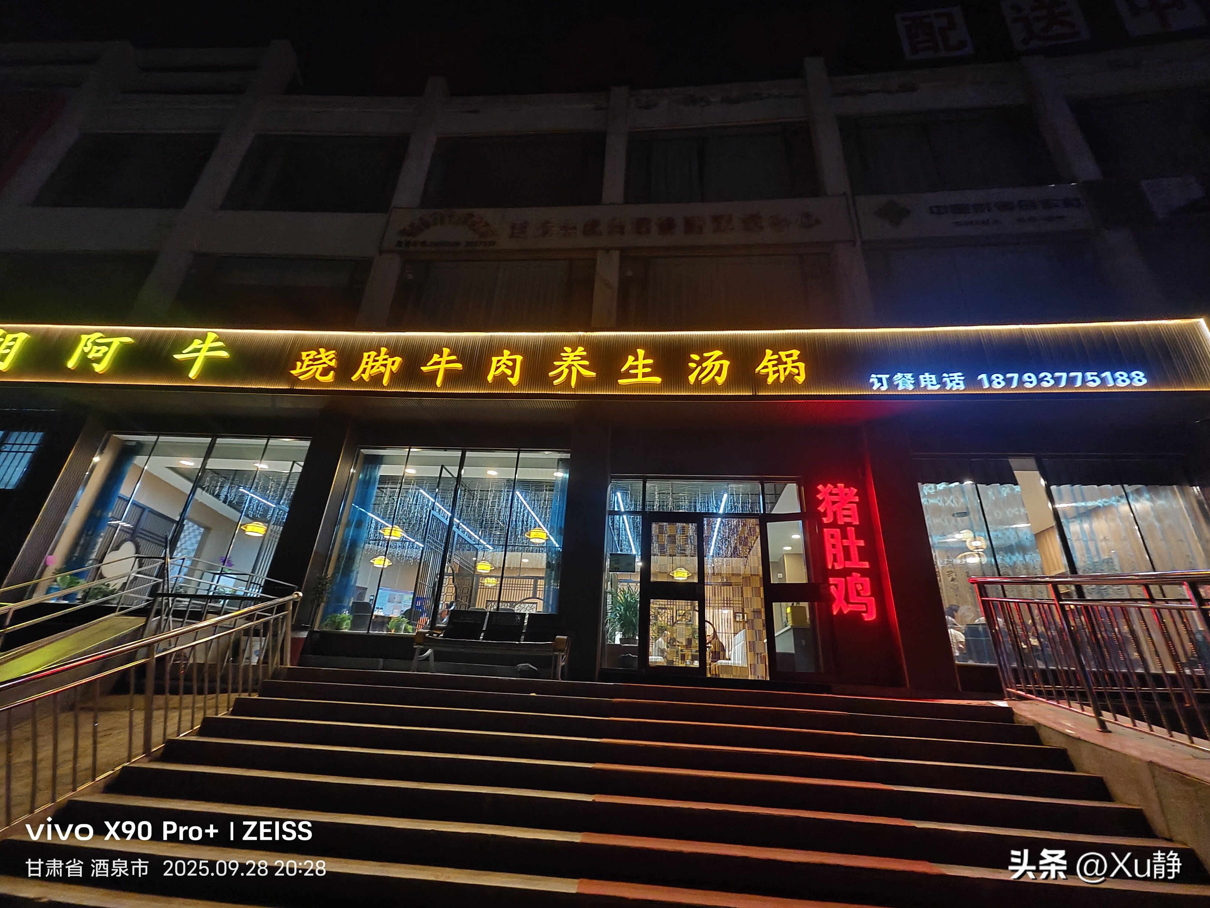 9月28日,从金塔胡杨林景区,坐大巴前往目的地酒泉,走连霍高速,6点30分到酒泉肃州区天喜大酒店,放行李,出来找吃晚饭的饭店,问了当地人,说拐角处的一家牛肉火锅挺好吃,过去看门头是翘脚牛肉汤锅,还纳闷翘脚牛肉不是四川乐山的美食吗,听老板娘介绍说是去四川学的翘脚牛肉的做法,开了店后,当地人不接受,经过改良适应当地口味,演变成现在的养生锅,分了几种口味,老板娘说,要是相信她,就按她给推荐的吃,我们就按她推荐的上的菜,锅底是用当地的黄牛牛腩肉和牛骨煮的汤,锅开后,先喝汤吃牛肉,汤鲜,牛肉肉质紧实,软烂鲜香,吃了锅底的牛肉,又开始涮牛肉和羊肉,大片的牛羊肉,沾了沾料,满口流香,这顿火锅吃的很满足,老板娘还送了一盘牛肉韭菜水饺。