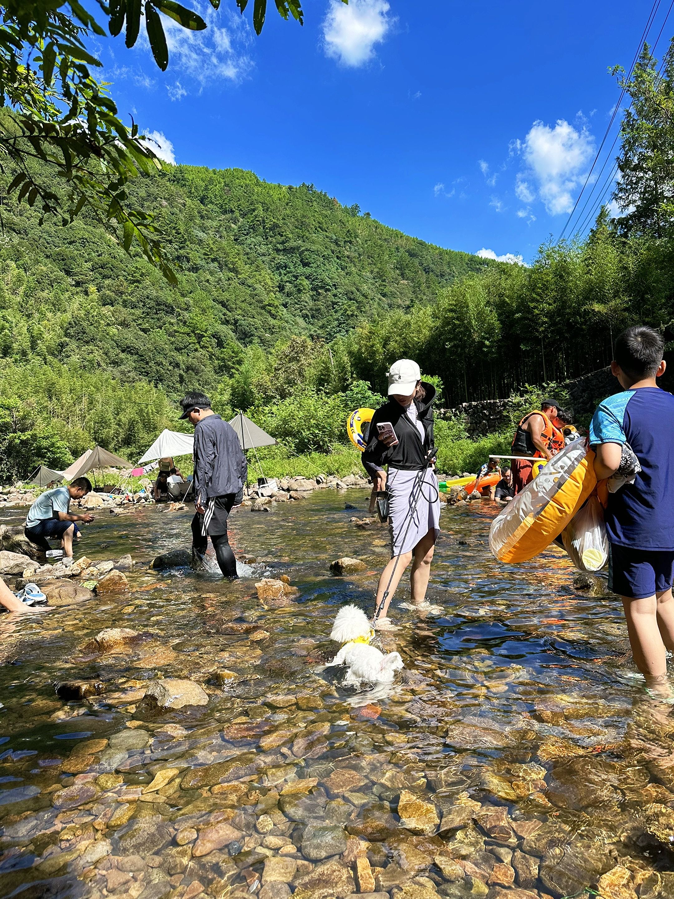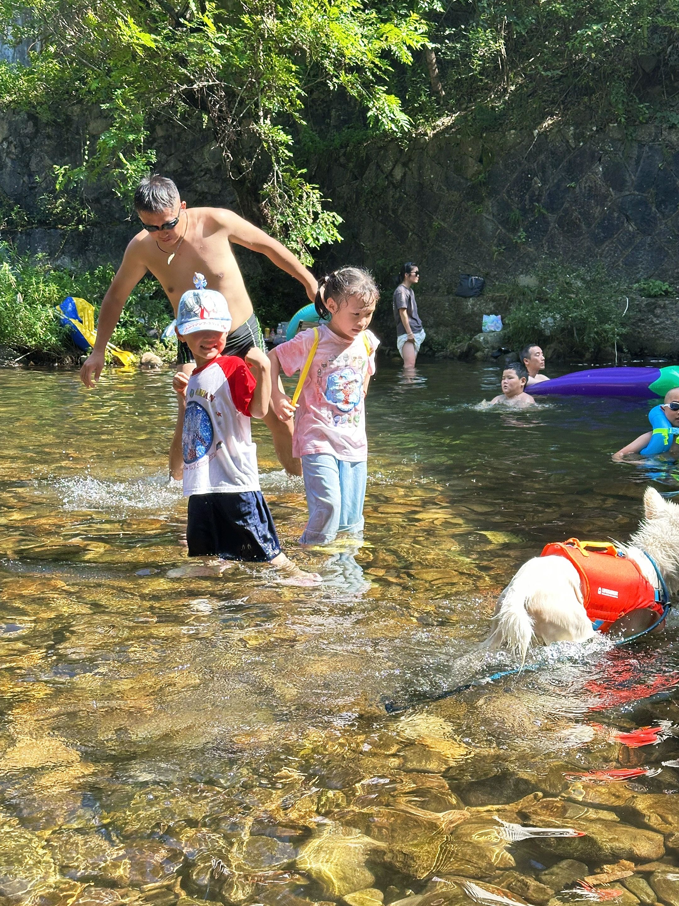 1.5m的潭水清得能看见鹅卵石,会游的直接跳进去扑腾,不会游的套个跟屁虫漂着看云,阳光透过水面照下来,连腿毛都在发光(不是