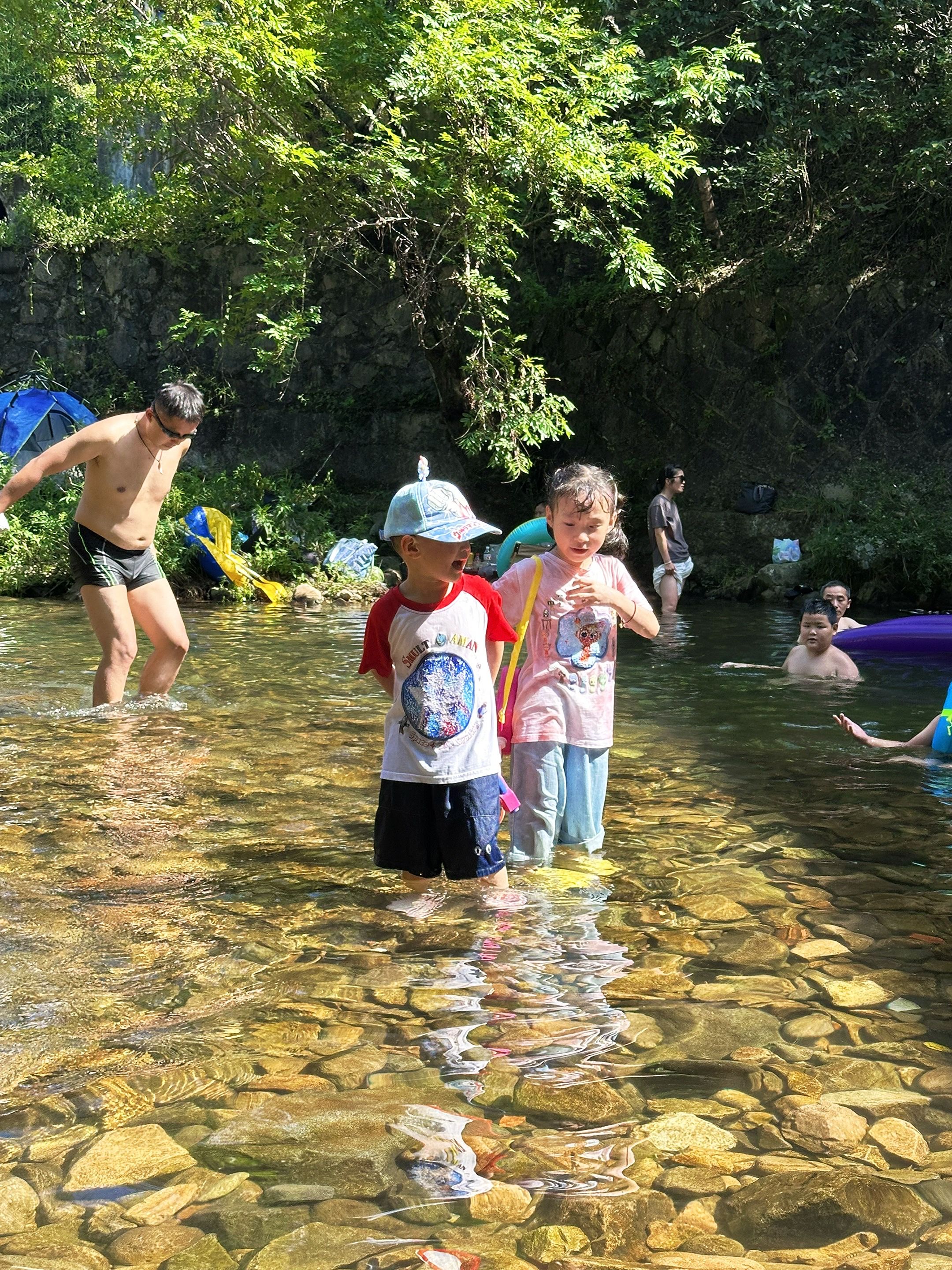 没过脚踝的溪滩,石头缝里藏着指甲盖大的虾米,小朋友蹲在水里扒拉半天,能抓满一小瓶“战利品”。岸边有树荫,铺块野餐垫就能看娃疯玩,老母亲终于能瘫着发呆~