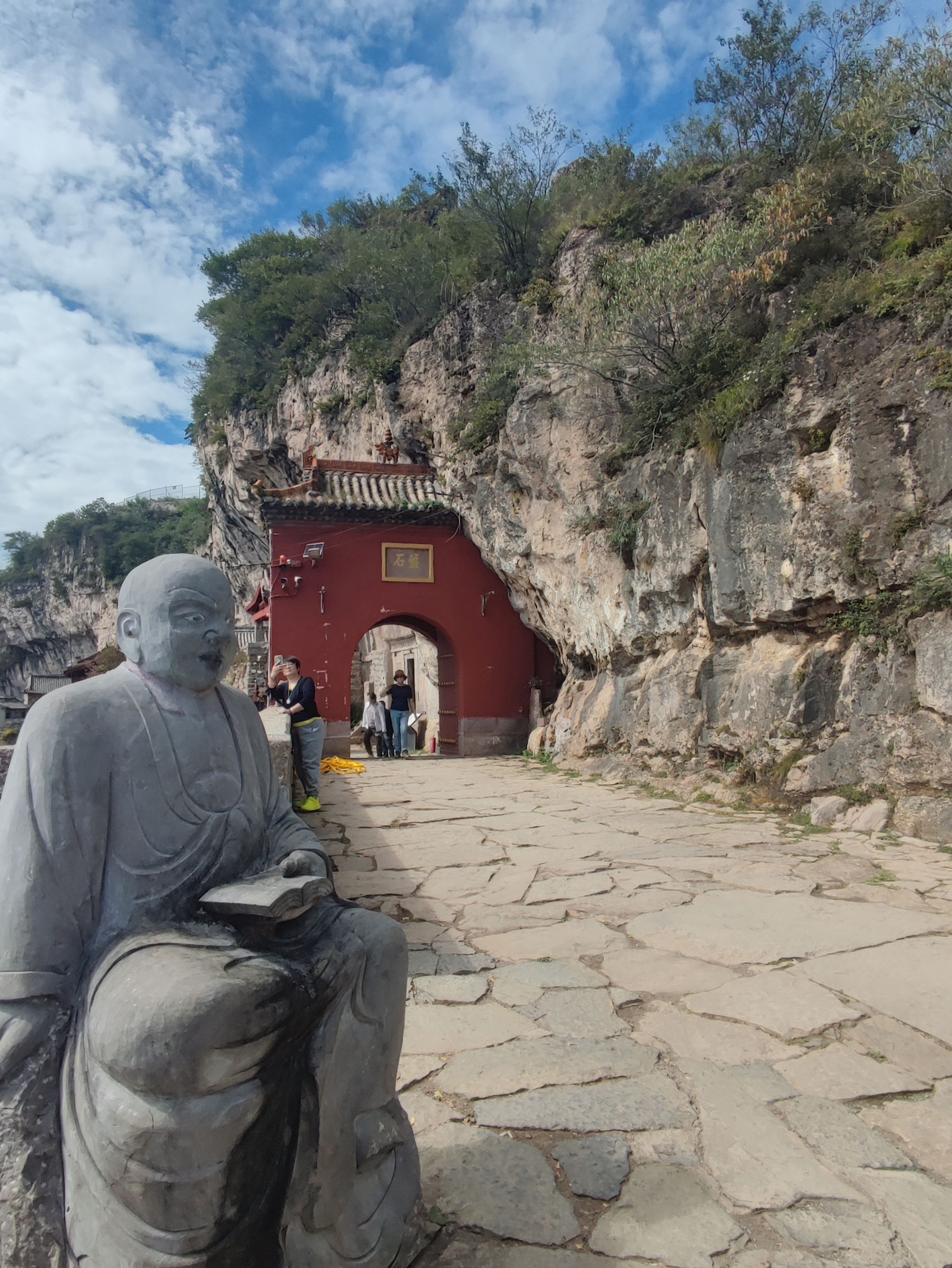 山路弯曲,但感觉不像邢台的蝎子沟与周公山盘山路哪么令人心有恐惧。一路向上来到南天门的岔路口,拐向四公里远的南天门,靠边停车,拾阶而上,峡缝中突现一个大大的洞口,顺阶而下,原来是个天然几十米深百多平米的天井,中央玉帝威坐,两旁有四个天王护驾,威风凛凛。旁还有地藏殿在洞在保佑众生平安,此处可下到洞底参观也可上到洞顶远观或俯视洞底的游客。