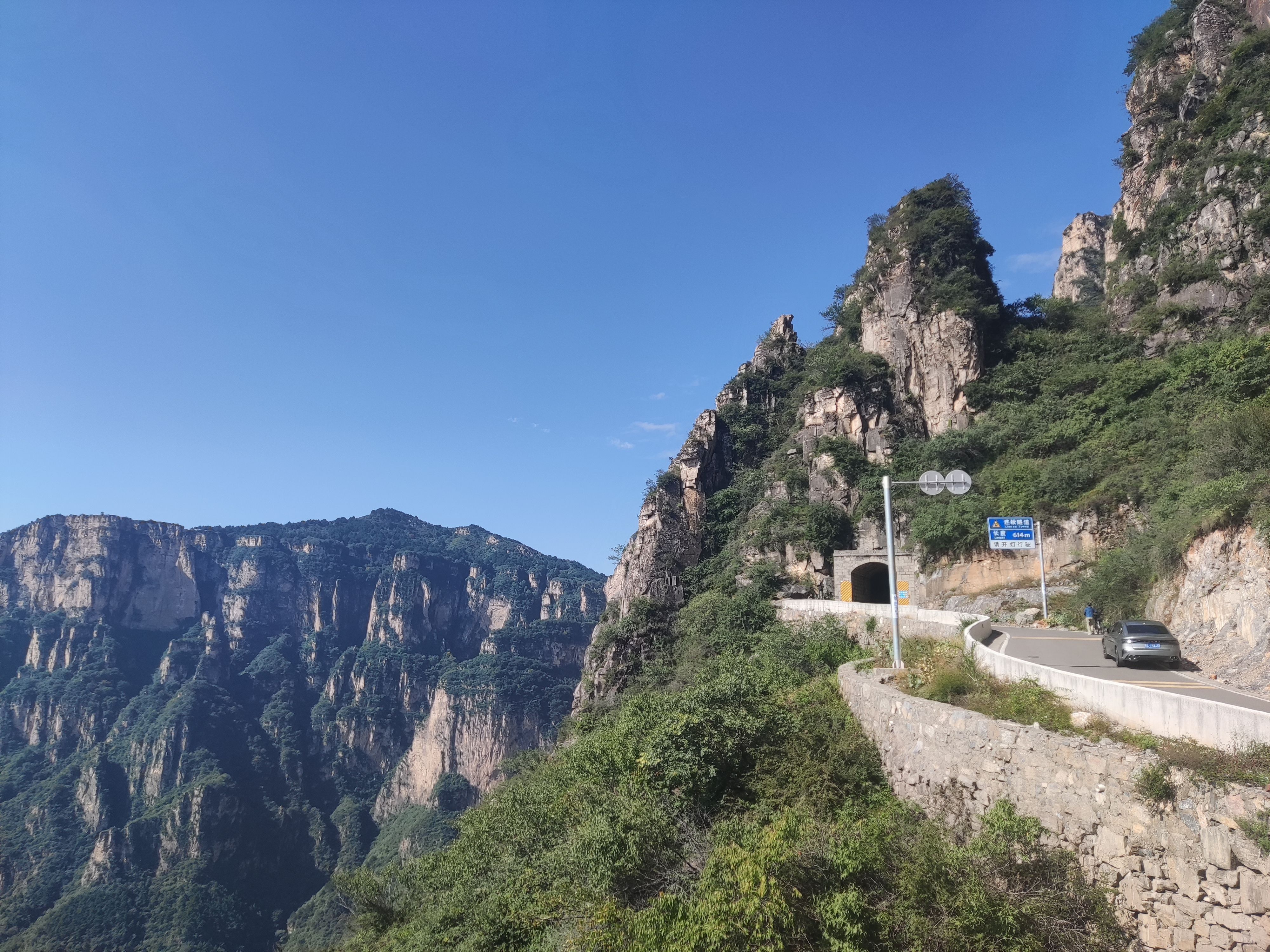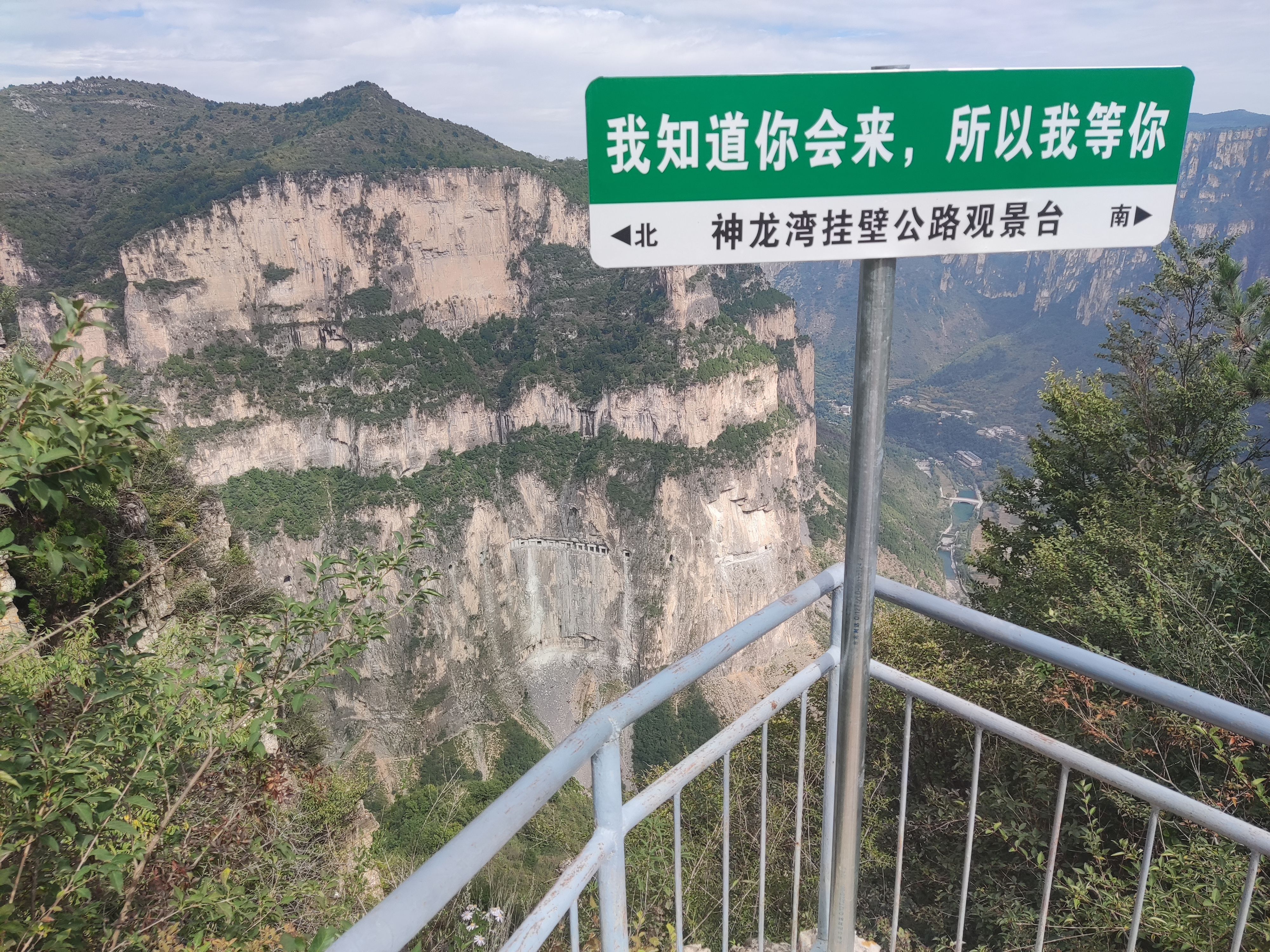 一个多小时后从南天门岔路返回到花壶线,继续前行奔向久负盛名的神龙湾挂壁公路观景台,这里可以说是车水马龙了,幸亏今天来此一游,否则十一假期岂不拥堵的水泄不通,会大大降低出游观感。观景台上拍照打卡的游客络绎不绝,但相互谦让,充分表现了中华民族的彬彬有礼。远望十年前曾徙步丈量过的神龙弯挂壁公路,几十个窗口点缀在高崖绝壁,再次被几十年前神龙湾村凿崖绝壁的开路人深深感染,敬佩敬佩。也希望早日把路上的坠石清除,打通公路,也不枉前辈人的开路心血。前世不望后世之师,先辈们勇于开拓的精神永远激励我们前进。