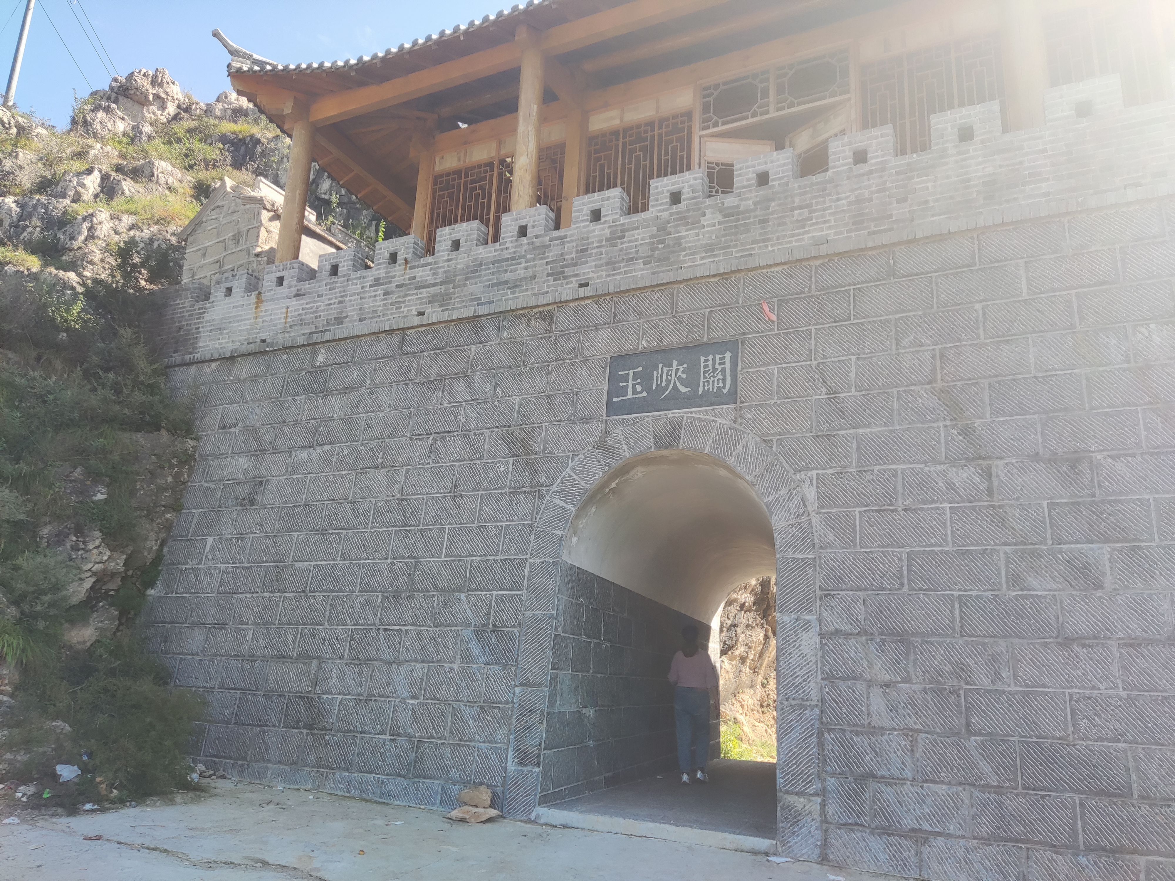 继续上行,穿过几个仅容单车通行还在滴答水的隧洞,曲里拐弯就来到别名风门口的玉峡关城门前,停车后穿过城门后的一线天可以再次居高临下,也可以上楼看层峦叠嶂。