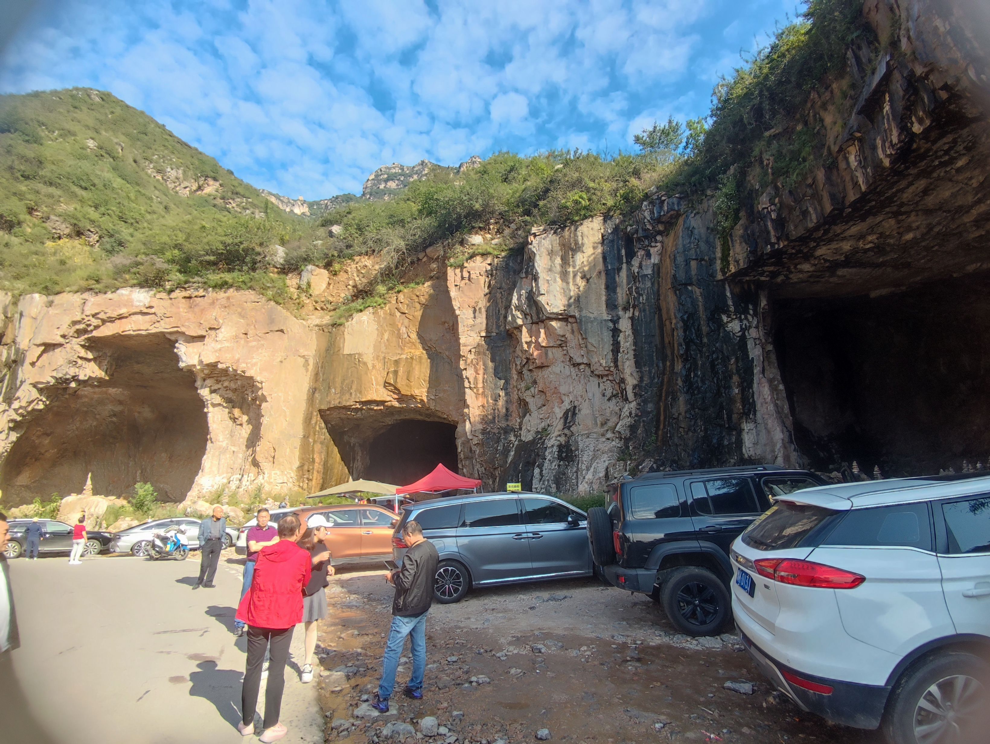 两个小时后在林州下高速,并没绕道城西的红旗渠大道去拍著名的太行阁,而是沿林州大道西行十公里再拐向南,斜插向八达村,半小时余过八达村就上了自驾圈威名震撼的花壶公路,一路盘旋而上,皆是双车道宽的柏油路,会车还算方便,几分钟就是一个观景台,由于是周五,路上的车辆并不多,但每个观景台总有三五辆车。先经过一组不知缘由的大大石洞,再盘旋而上就到了隧道口观景平台,几十个人在此打卡拍照,居高临下,俯视林州城与广茂平原上的散落村庄,站在太行之巅的感觉油然而生。