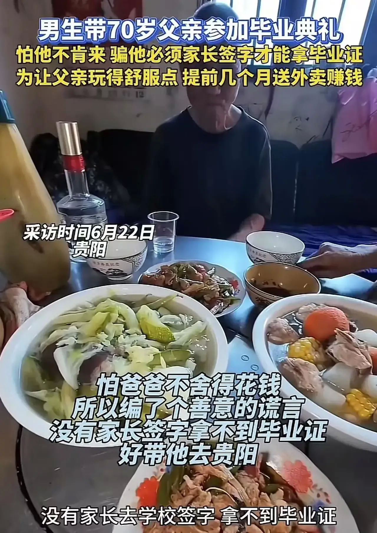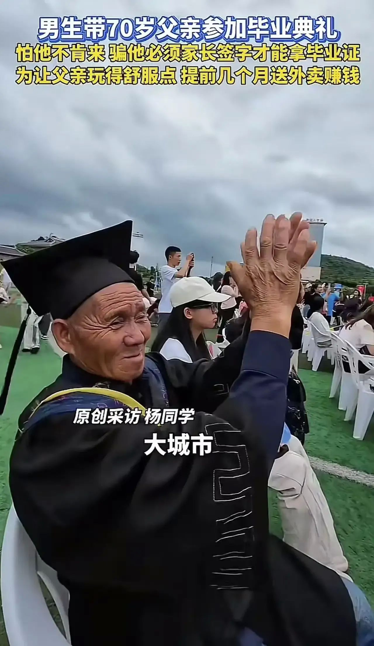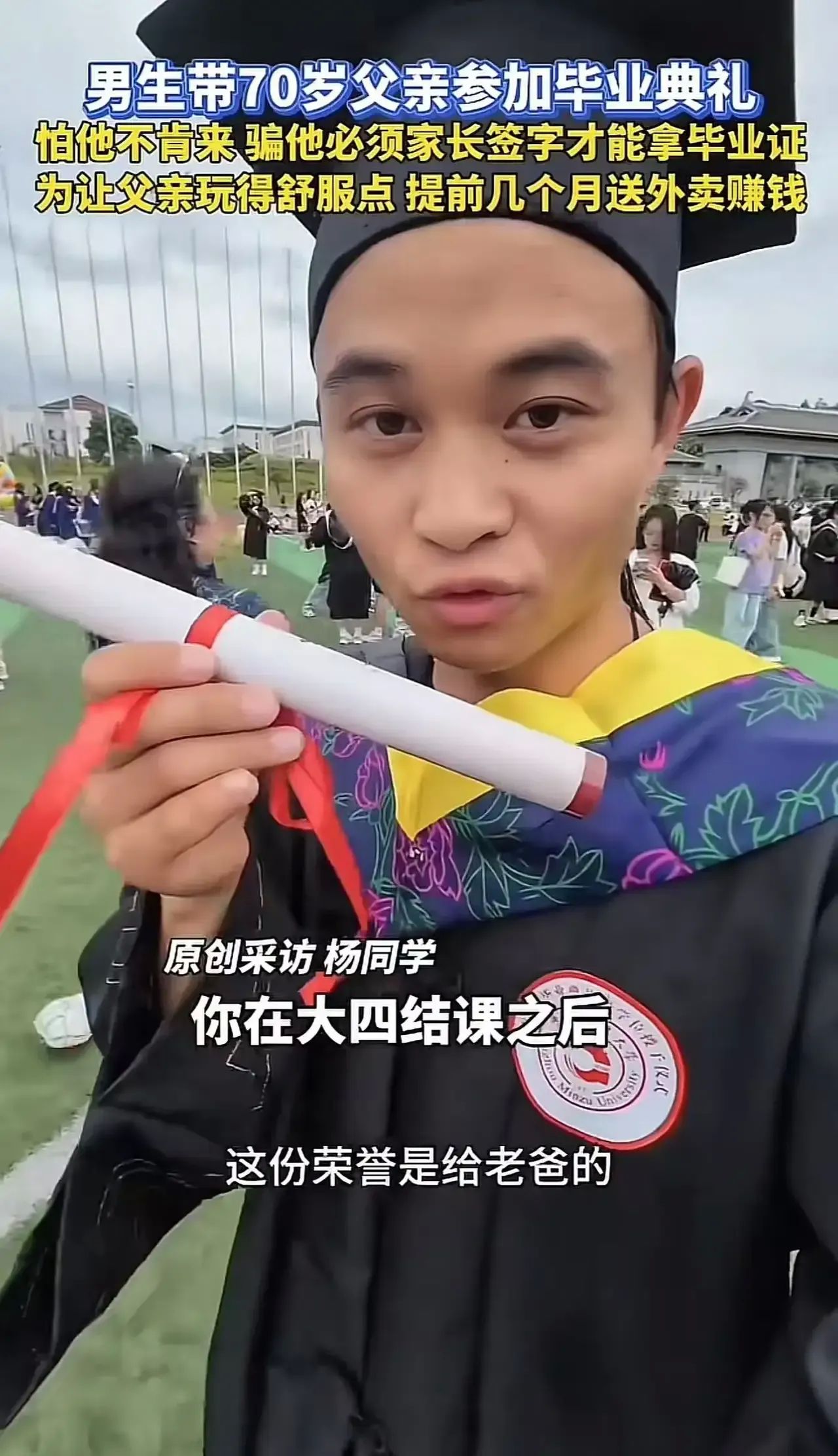 那天清晨,父亲带着一脸的期待和不安,站在学校门口,看着儿子穿着学士服,笑得那么灿烂。男孩偷偷抹去眼角的泪水,心中满是感激——感谢父亲的无私,感谢自己坚持的那份梦想,也感谢那份跨越山海的父子情。