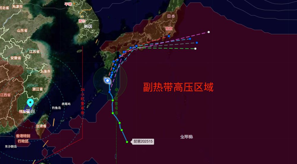 由于目前副热带高压的位置和形状就处于日本南侧边缘,因此未来台风“琵琶”将沿着副高边缘,走出“描边”路径,可能先 过或登陆九州岛,之后登陆或擦过四国岛,然后再登陆或擦过本州岛。