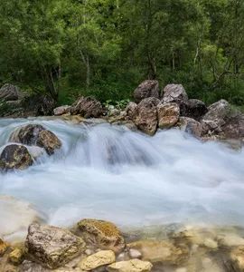 沿着蜿蜒曲折的小径前行,便能邂逅那灵动的溪流。清澈见底的溪水沿着山势潺潺流淌,水底的石头与沙砾清晰可见,在阳光的折射下闪烁着细碎的光芒。溪水时而欢快地跳跃过凸起的石块,溅起晶莹的水花;时而平缓地流淌,倒映着两岸的青山绿树,宛如一面流动的镜子。溪边,不知名的野花肆意绽放,五彩斑斓的花瓣在微风中轻轻摇曳,仿佛在与溪流一同舞蹈。