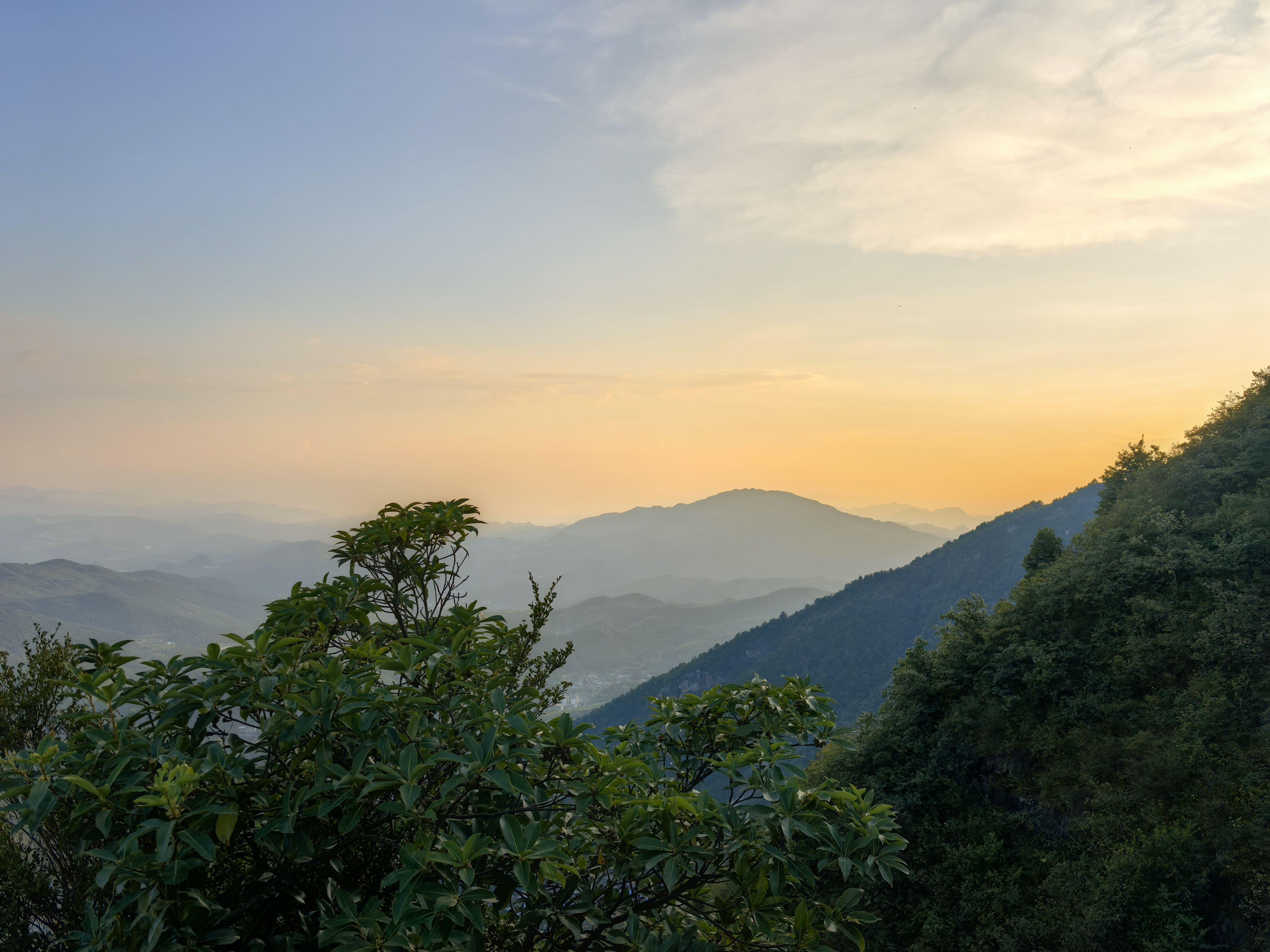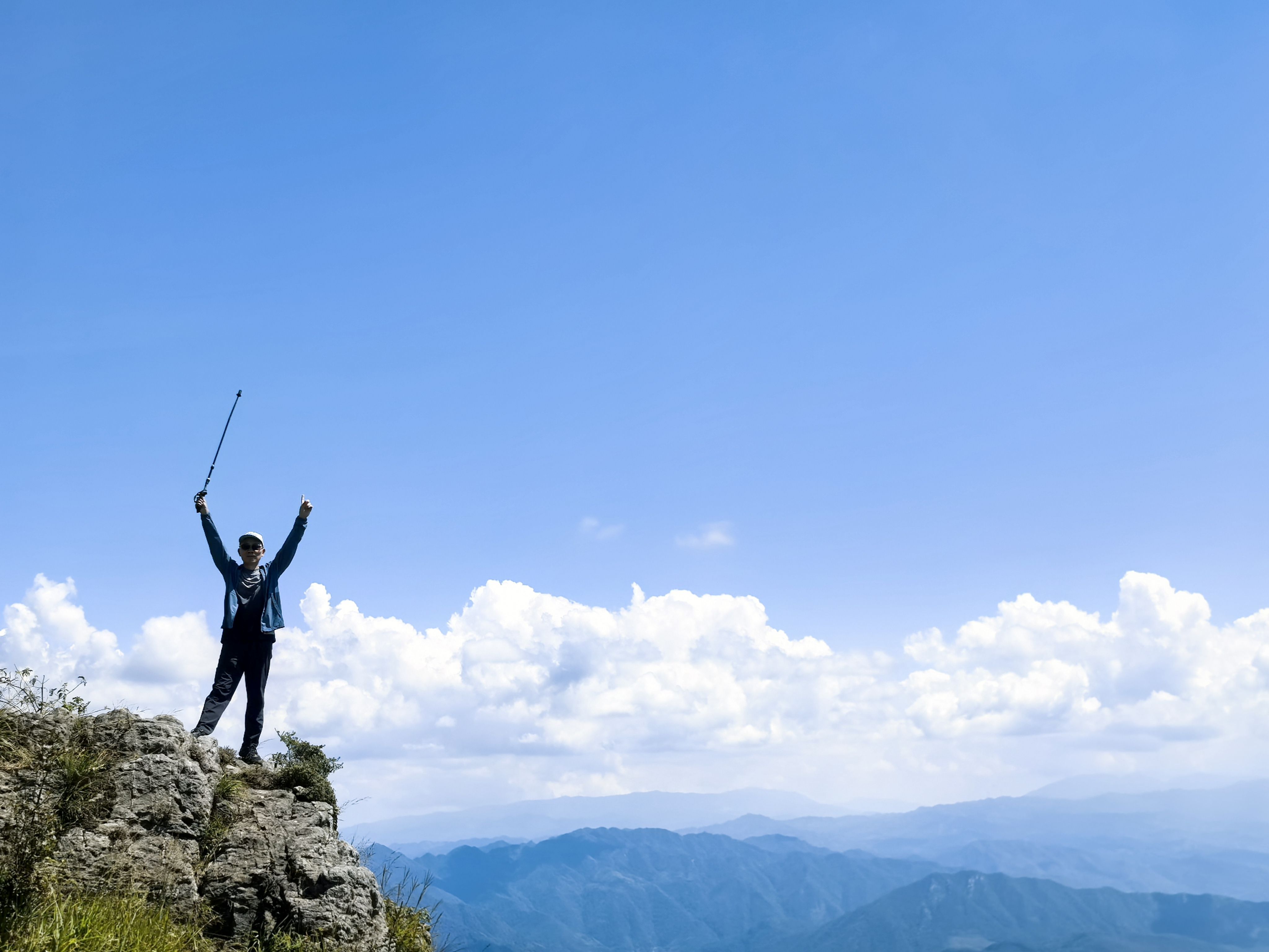 途中,我们遇到几位贵州来的重装驴友,他们应是打算在山顶露宿看日出拍照。爬山起初很累,适应节奏后会轻松些。默言年纪最大,爬这种难度的山有些吃力,大家都按自己的节奏前进。越往上,海拔越高,透过灌木看到山峰和蓝天,让人满怀期待。走到山脊,被披着黄色外衣的大山美景折服,远处山峦起伏,蓝天白云相得益彰,驴友负重前行的队伍也是一道风景。拍照打卡,留下最美瞬间,是户外人的选择。闲暇时翻翻相册,便是最美的回忆。