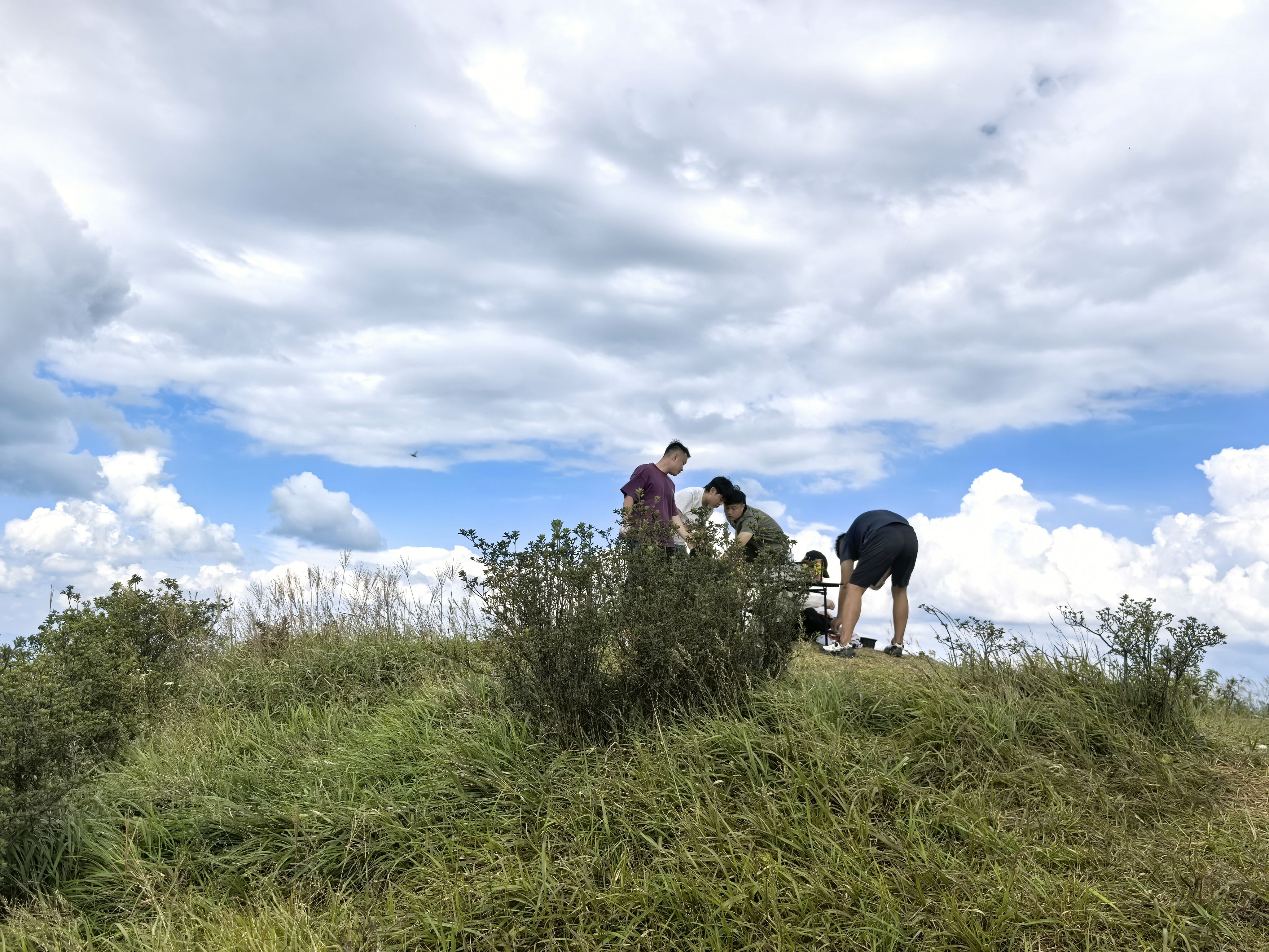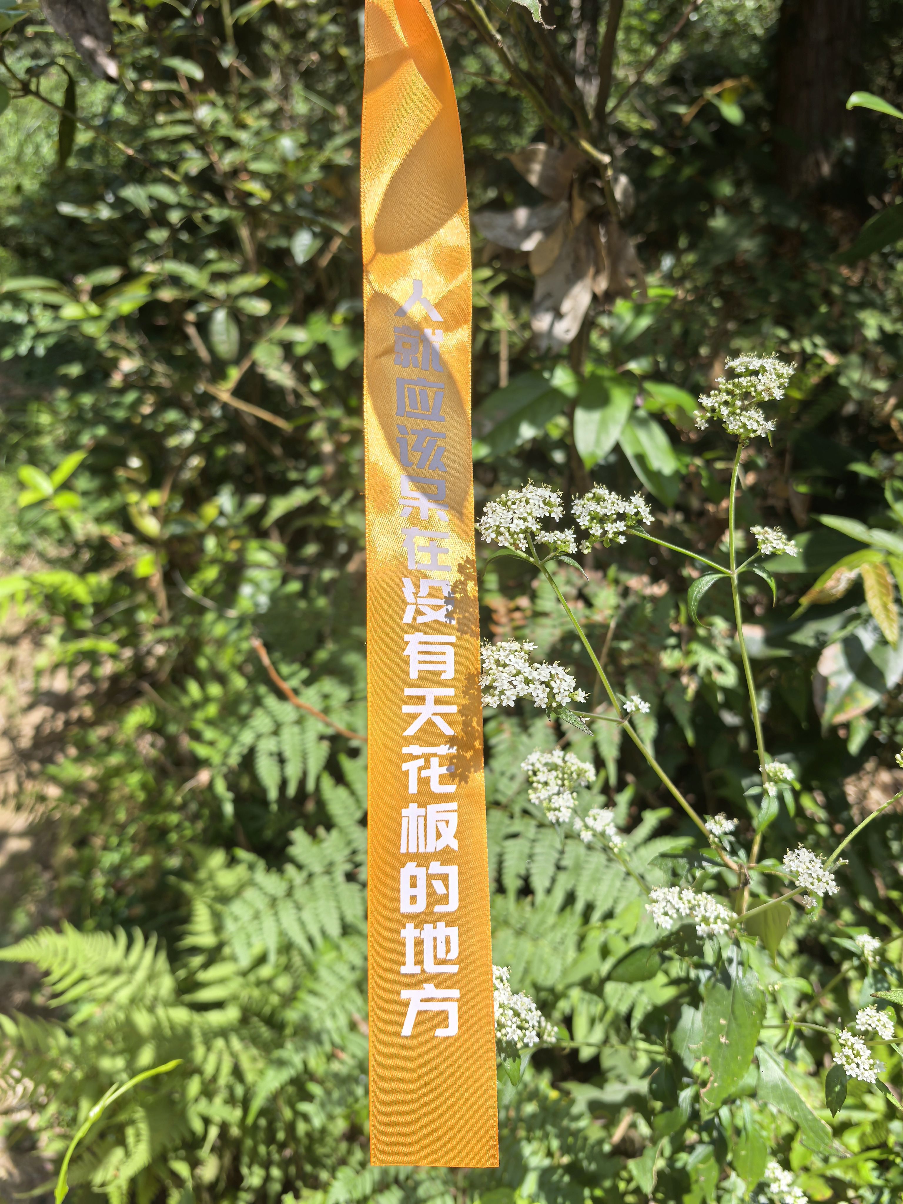 山依旧,路如初。早上8点20分,我们从市中心出发,经夏蓉高速,在里田下高速后前往瑶岗仙钨矿区。我们把车停在液化气站旁,需缴纳20元停车费,收费大姐热情地为我们指明方向。此时,手机显示已是北京时间10点16分。登山前,我们遇到一位宜章当地小伙子,他热情邀我们搭一段便车,因车子还能往上开,默言大哥想着节省体力,我们便把背包放车上,其余7人徒步上山。烈日当空,走几百米后,在分叉路口右拐便是登山小路。再往里走,看到树枝上系着的五彩绸带,就知道方向没错,可大胆前行。户外驴友“赠人玫瑰,手有余香”的举动,总让我心生感动。