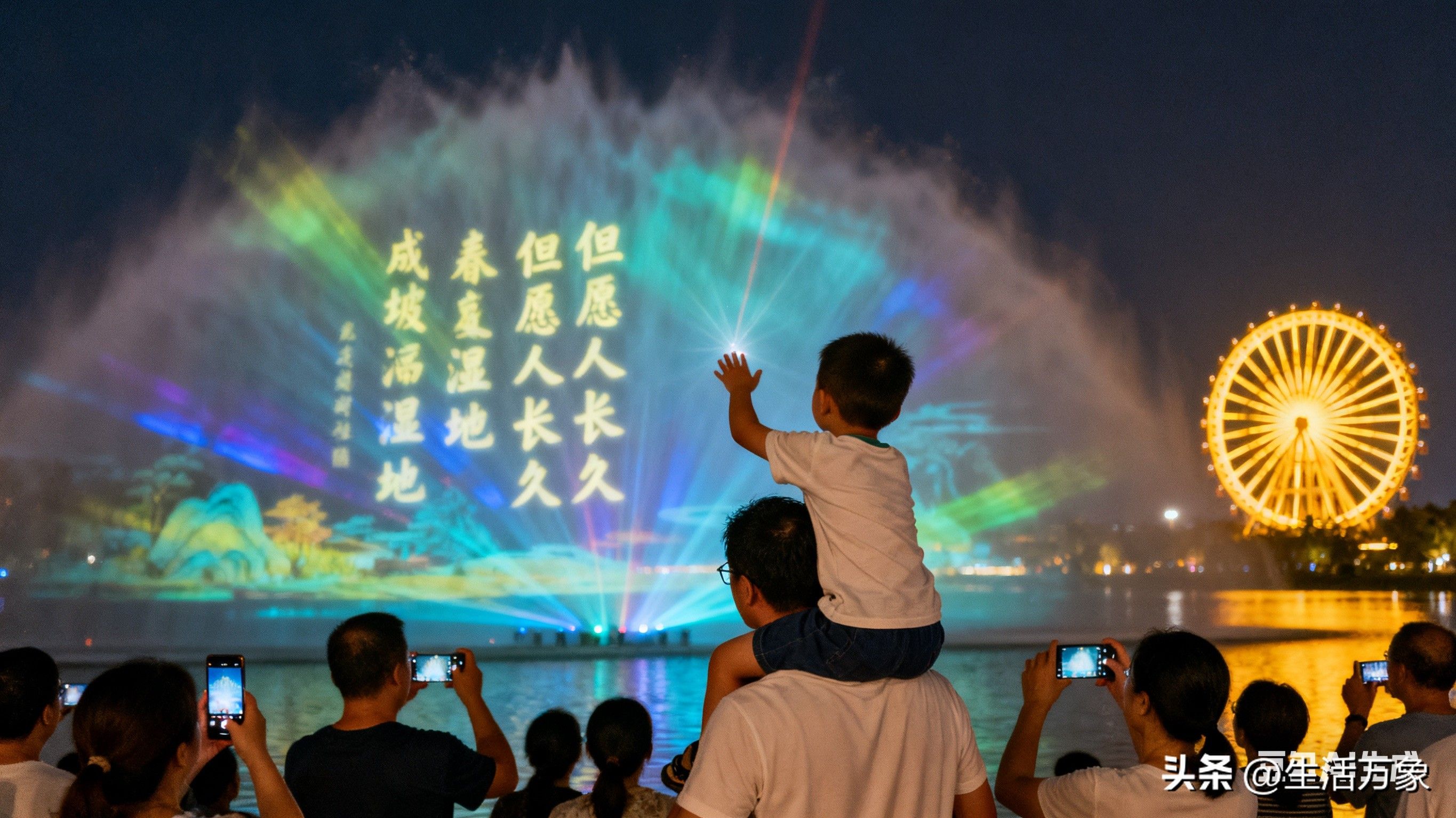 傍晚别着急走,去东坡湿地公园看一场水舞秀。当灯光亮起,岷江水面上跳出苏东坡的诗句,“大江东去”的豪迈、“竹杖芒鞋轻胜马”的豁达,随着水幕在夜色里流淌。孩子会指着那些发光的文字问东问西,你忽然发现,这场旅行早已不是简单的“看风景”,而是让孩子和千年前的苏东坡,完成了一场跨越时空的对话。