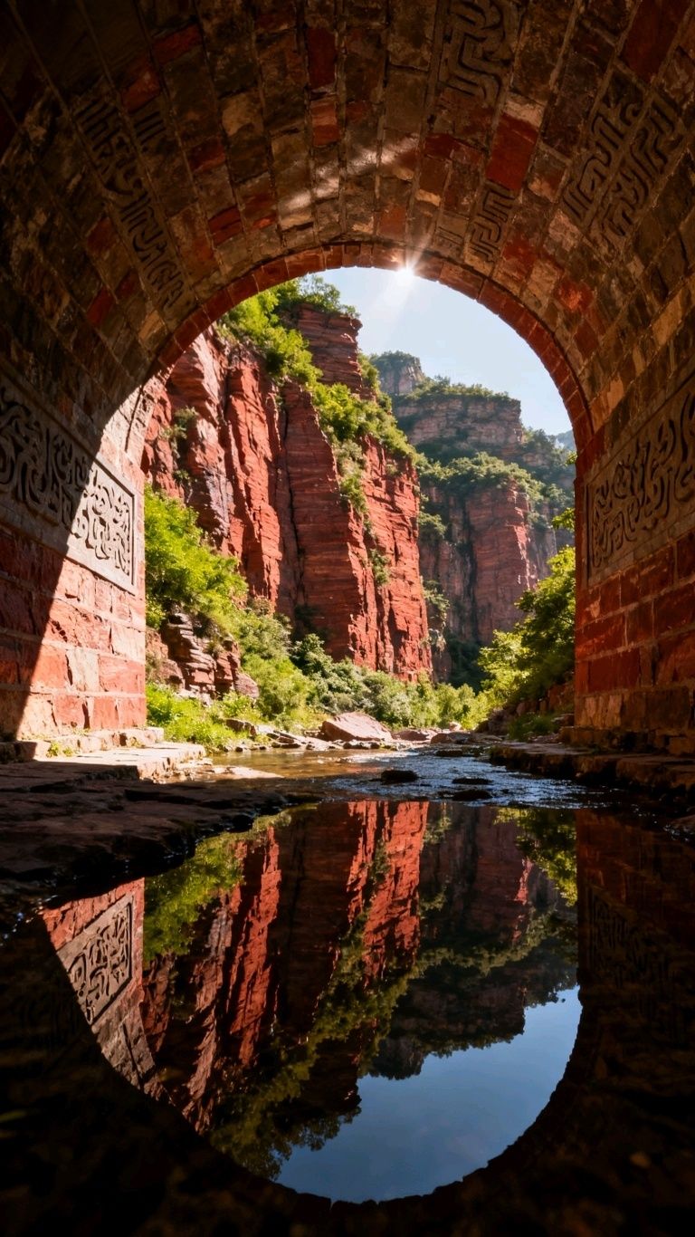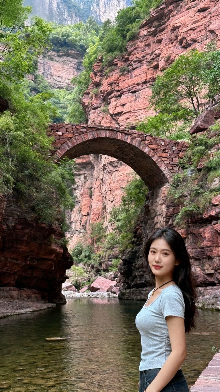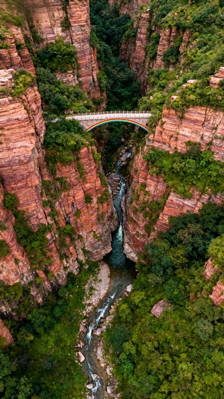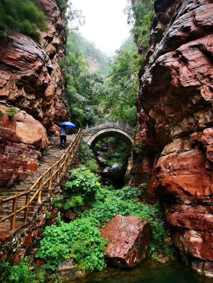 最绝的是那座石拱桥,横跨在两山之间,像道古老的眉眼。我撑着伞站在桥洞下,看阳光从岩缝里漏下来,把水面切成碎金,红岩的倒影在水里晃啊晃,恍惚间竟分不清是山在动,还是水在流。有瞬间觉得,这丹分沟哪是沟,分明是太行把自己的“山海梦”,偷偷藏在了这一方天地里。