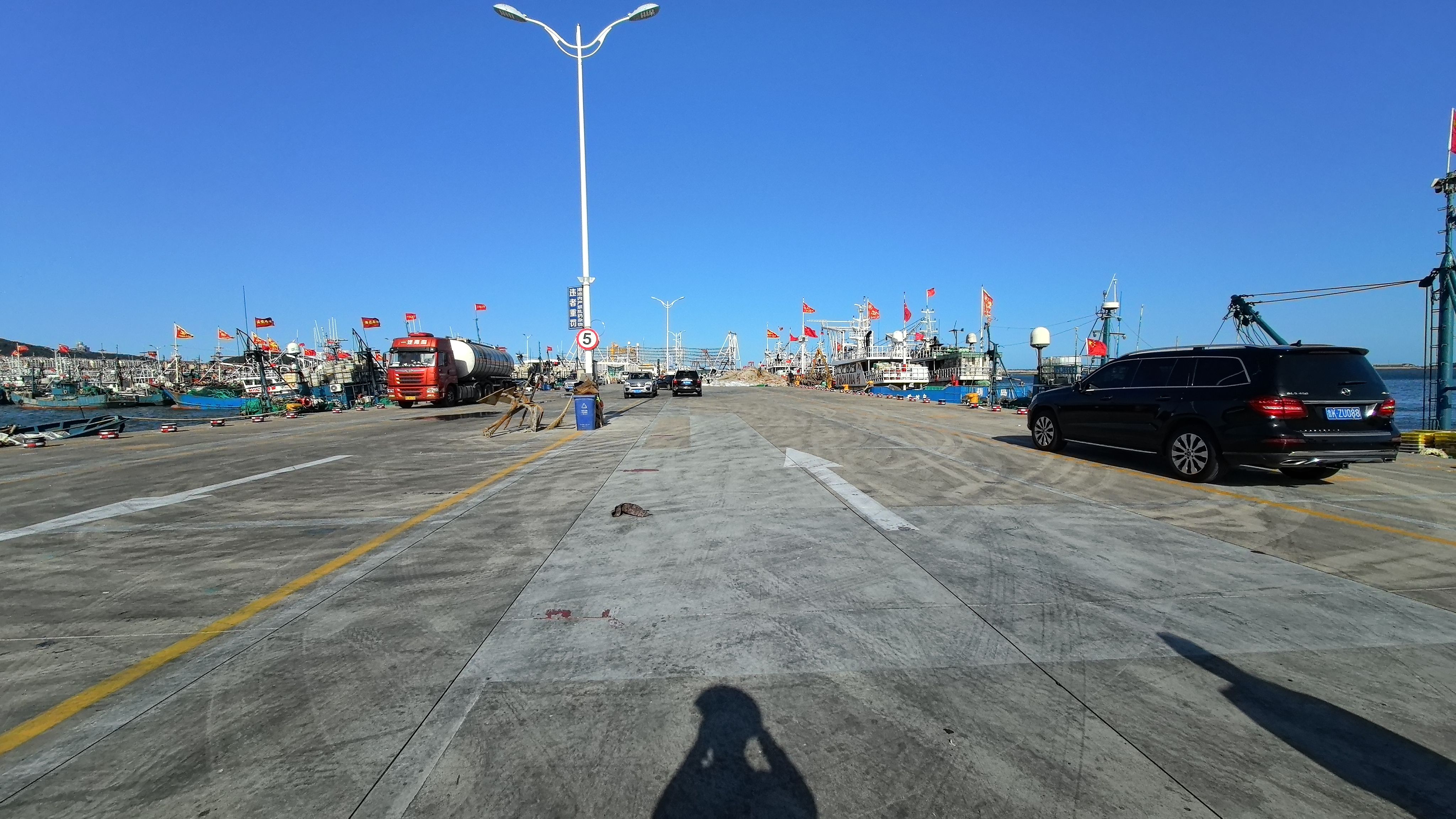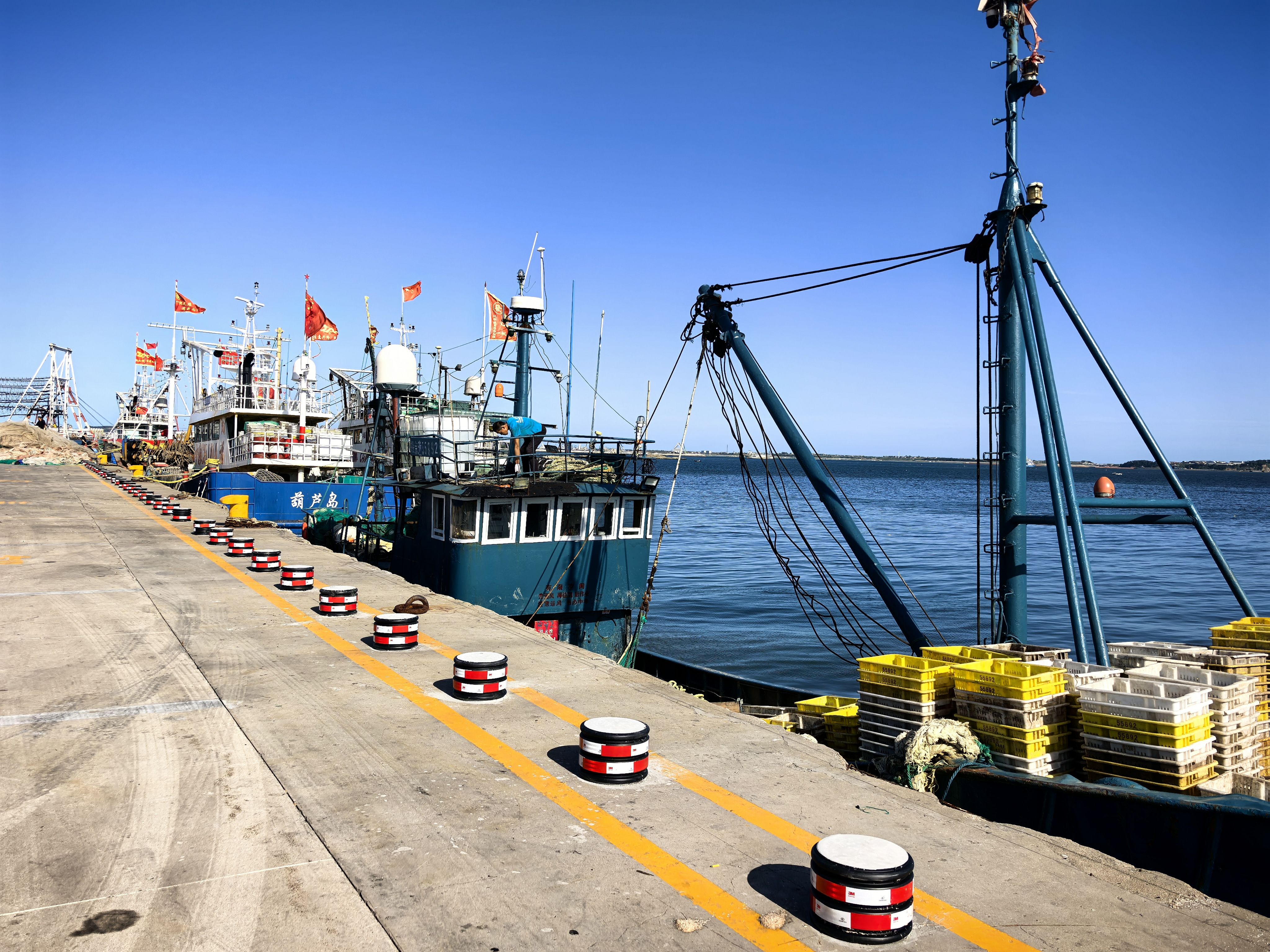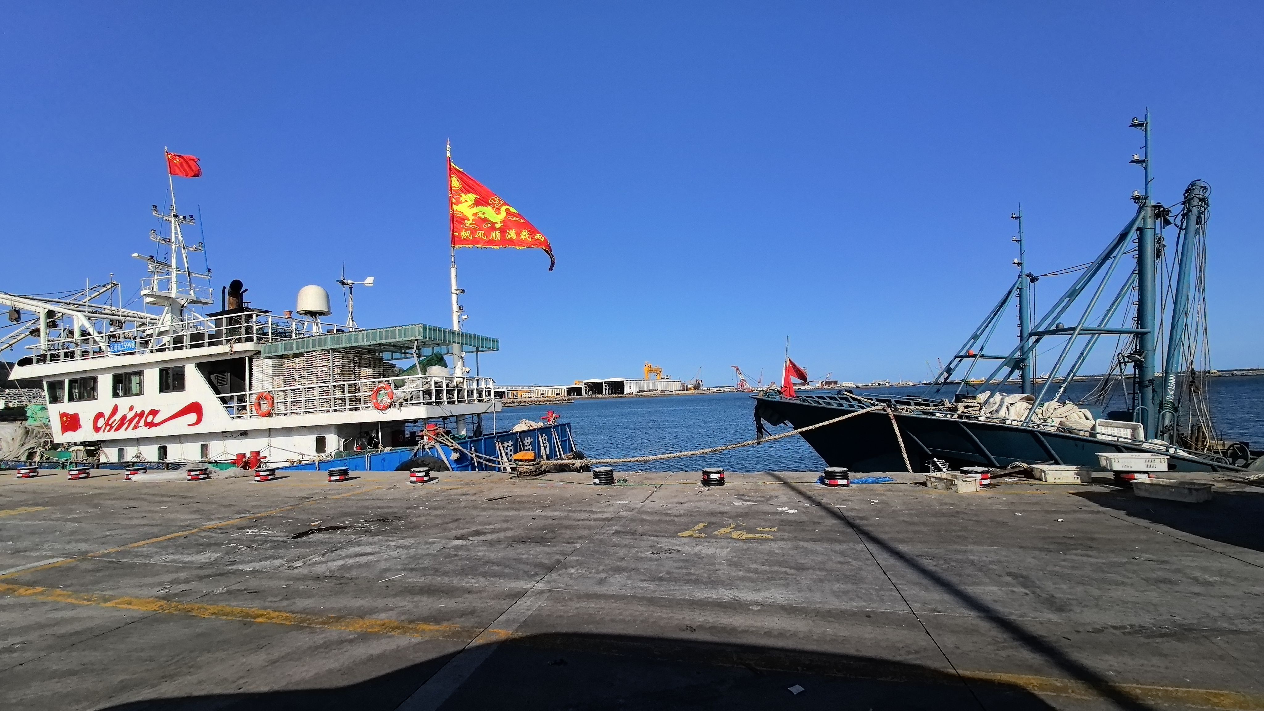 港口停靠着各型渔船,犹如一幅美丽的画卷,船上红旗招展,彩旗飘飘,每艘船的最高处,都挂着一面绣着金龙的大旗。