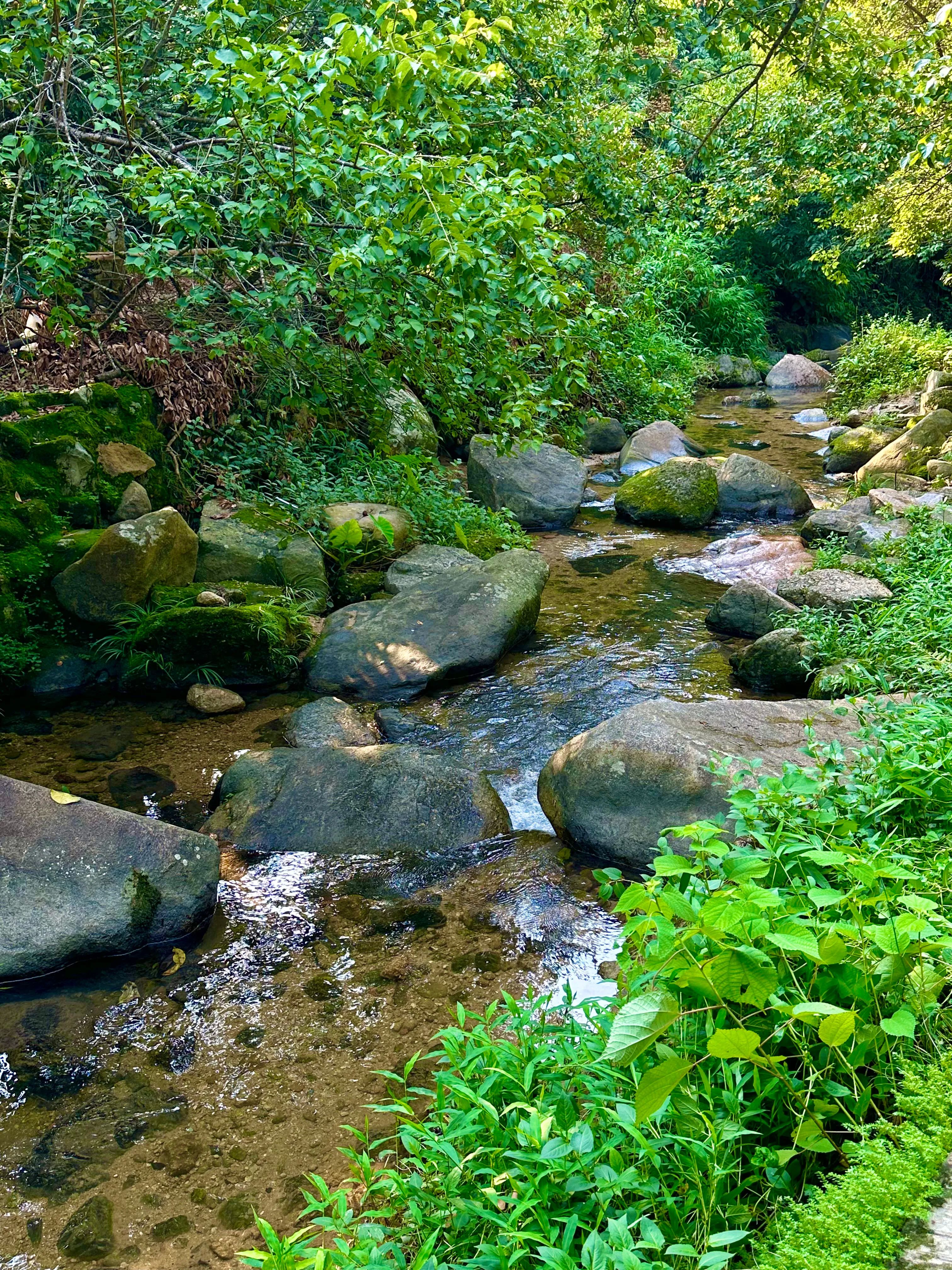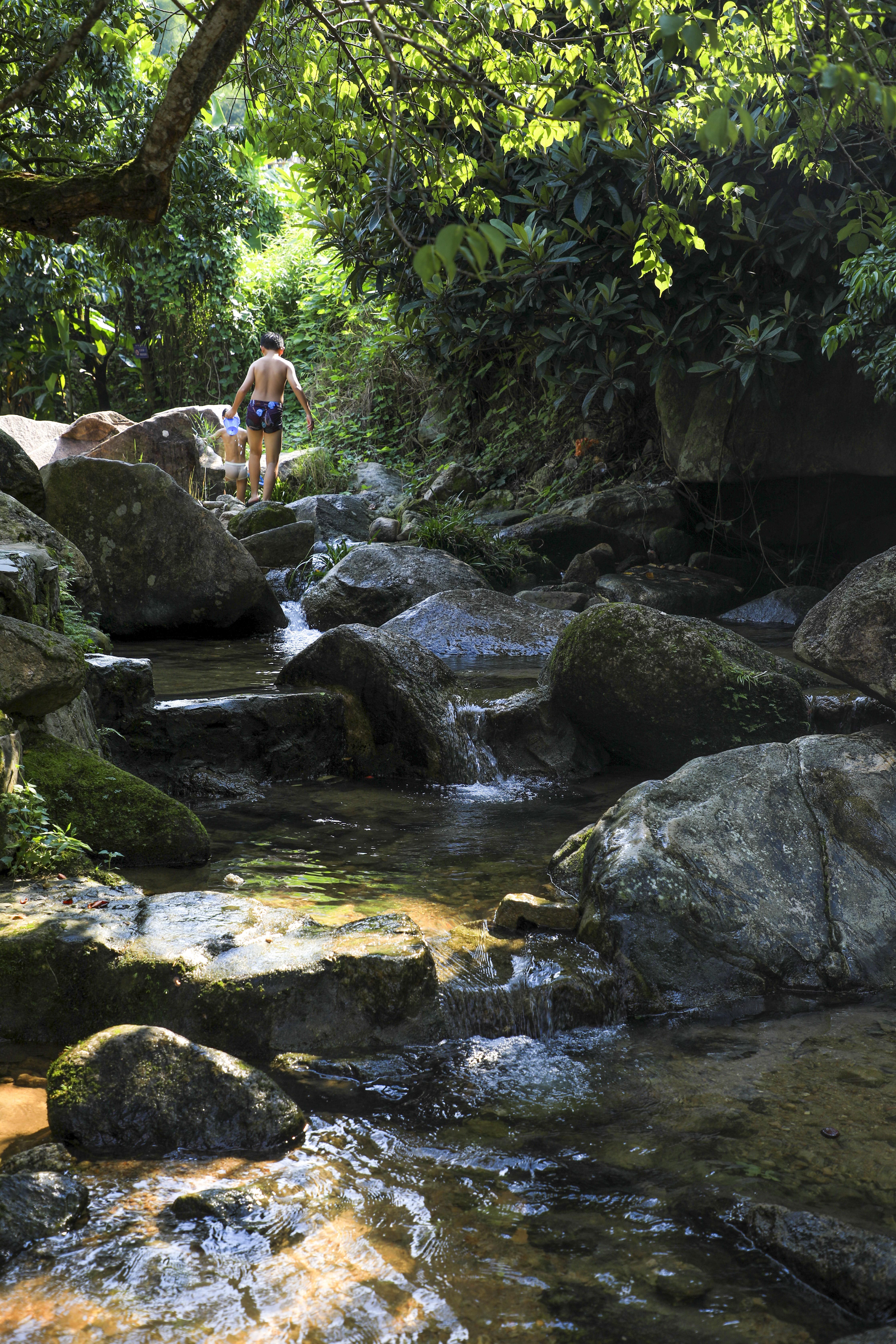 溪流很长,贯穿整个小镇,石头把小溪自然分为一个个小池子,清凉又清澈,水里有很多小鱼,可以溯溪、玩水、捉鱼。