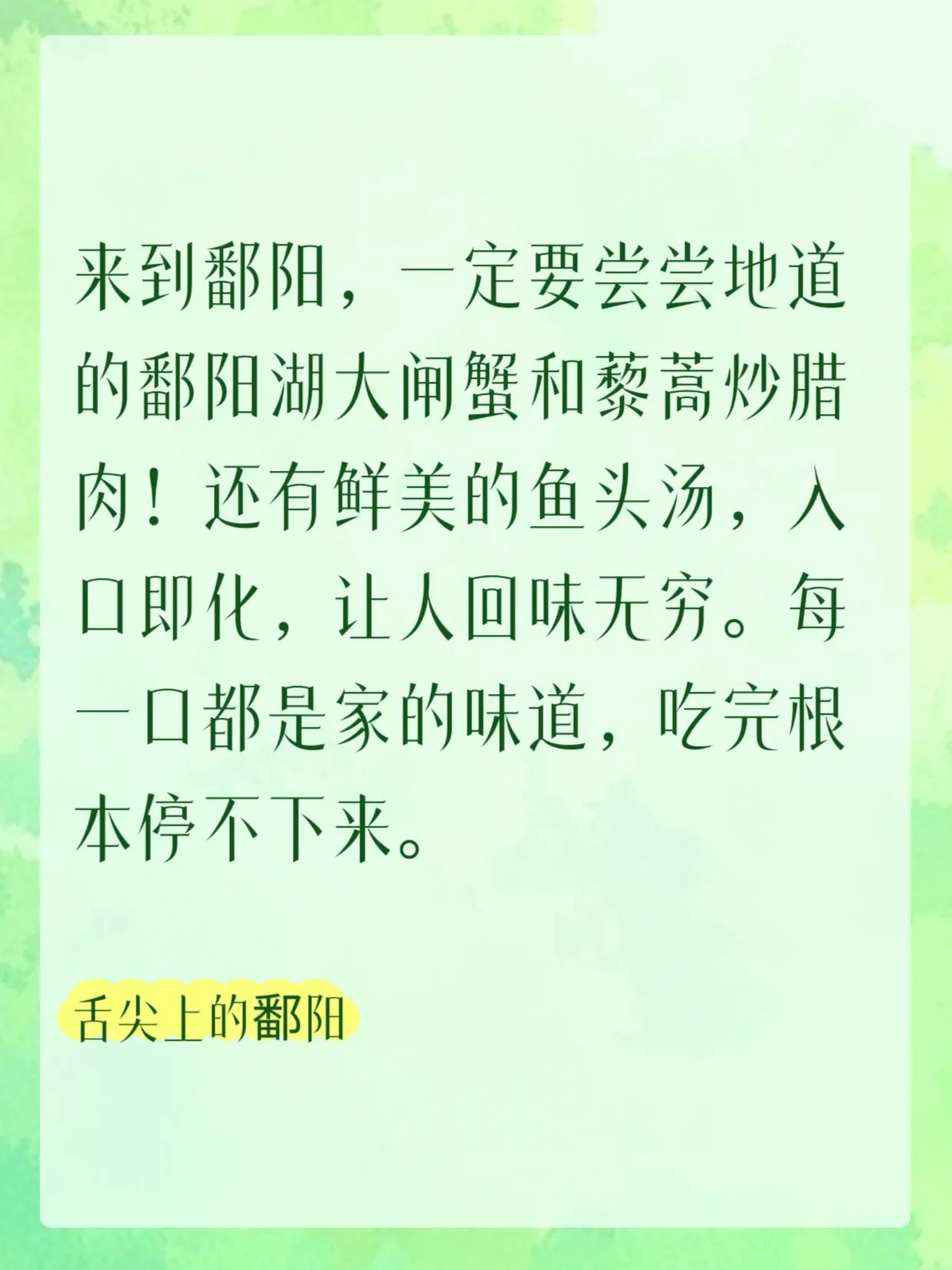 此外,鄱阳湖还有“四季时鱼”(春鲇、夏鲤、秋鳜、冬鳊)和“鄱阳三鲜”(银鱼、鳗鲡鱼、凤尾鱼)。