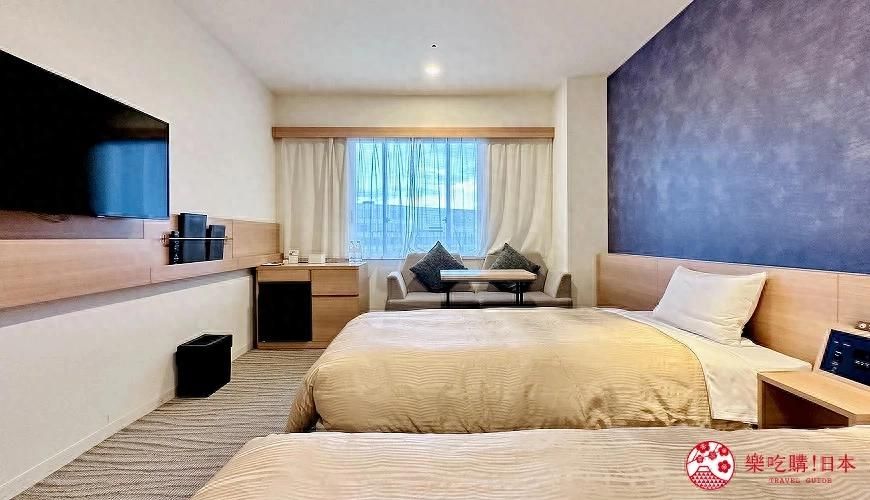 「西铁Inn福冈」的房型主要分为单人房、双人房,以及双床房,另外每种房型又分别有普通房及高级房可选,其差别在于休憩沙发的大小,硬体设备以及浴室翻新等细节,但都同样舒适整洁。而比起一般市中心狭小的商务酒店,这里的房内空间算是相当舒适,虽然称不上非常宽敞,但行李箱全开绝对没问题!