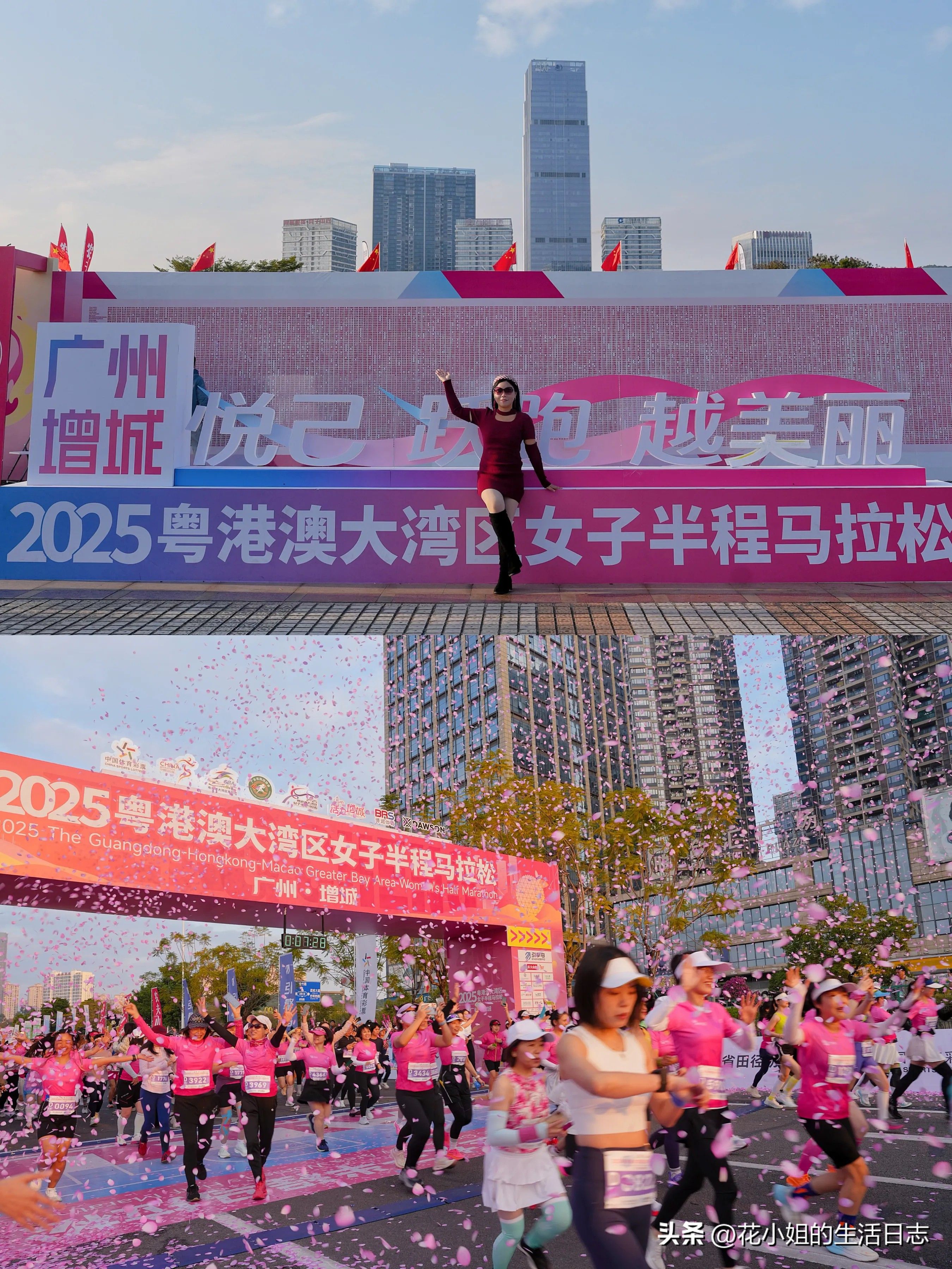 选手们迎着花瓣雨出发,沿途经过了圣皇洲、樱花园、荔湖公园、增江画廊、万寿禅寺……