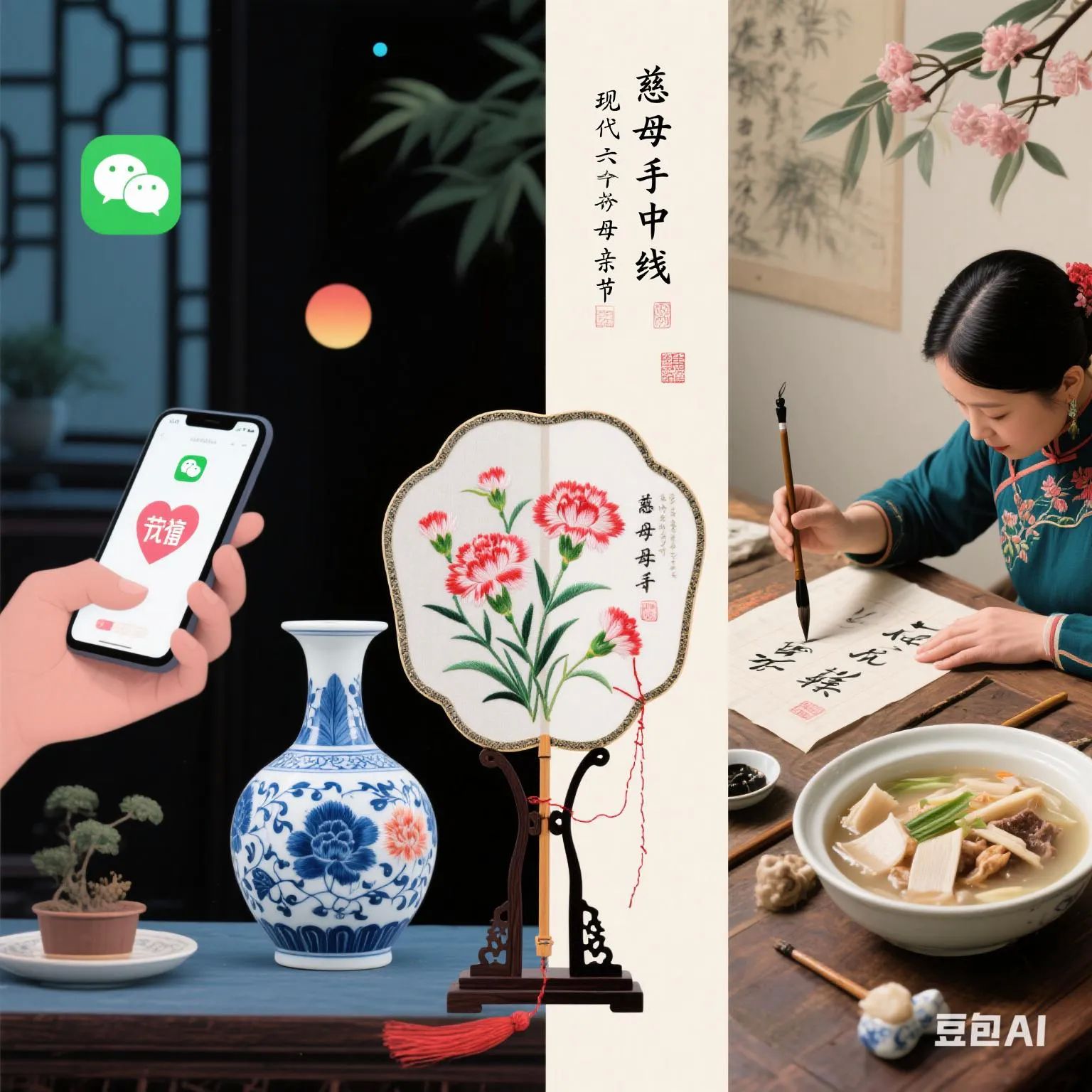 在这个中西交融的时代,我们既可用微信发送节日祝福,也可重拾毛笔写下家书;既能送上进口巧克力,也能亲手烹制母亲记忆里的腌笃鲜。苏州绣娘将康乃馨纹样融入苏绣团扇,景德镇匠人把"慈母手中线"的诗句烧制在青花瓷瓶,传统与现代的对话中,孝心始终是最温暖的文化底色。
