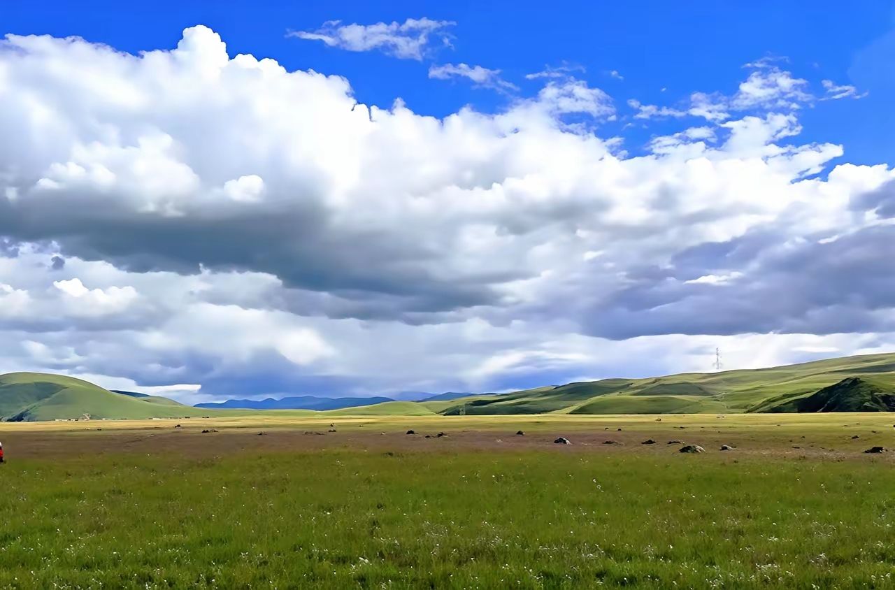 经过拉龙措后,盛大的草原风光迎面而来,绿色的草原曲线起伏,层层叠叠,像波浪荡漾开去,一望无边,天接地连,人、车、蓝天白云、草原紧紧地融为一体。