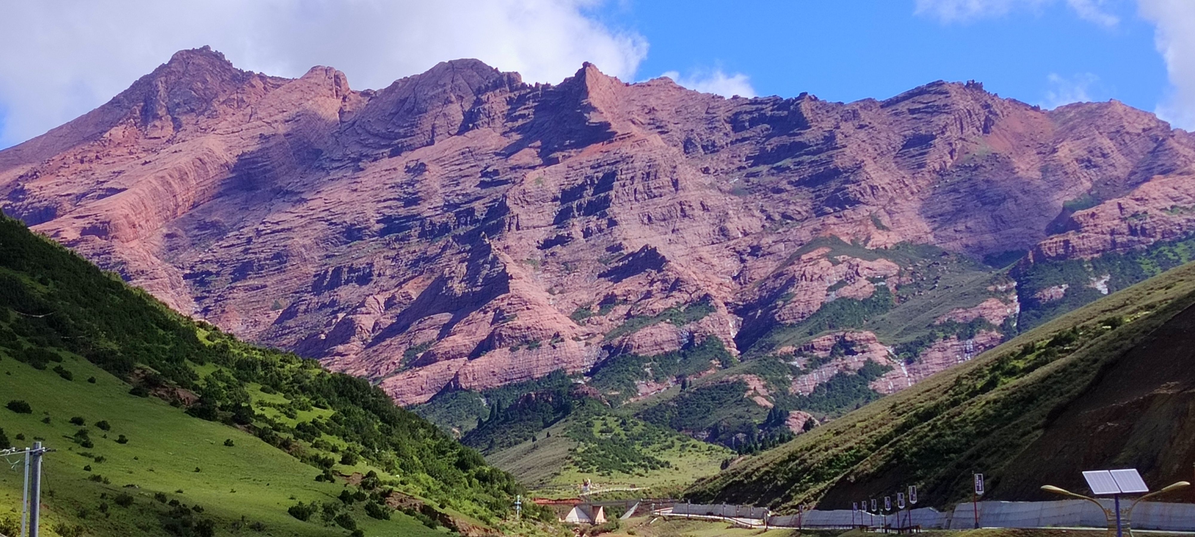 红山位于与甘孜相连的新龙县境内,在海拔4000多米以上,属高原型丹霞地质奇观,我们翻过一个垭口后,就看见左手边红红的山峰,与雪山组合,画面感极强。沿着红山下到低洼的草甸。导航把我们引到游客中心,无人,最后行车2公里到河谷上,才找到新的游客中心。