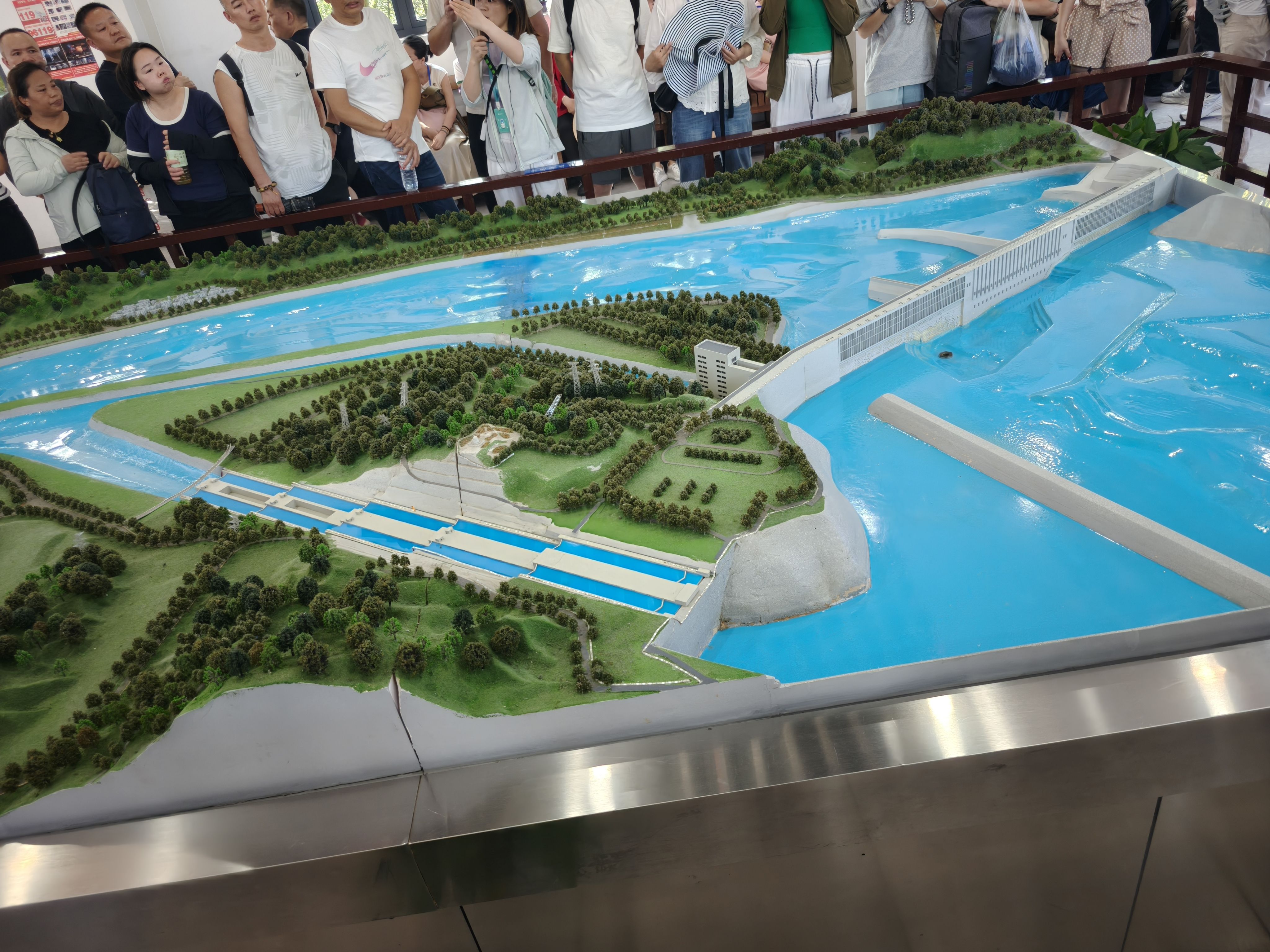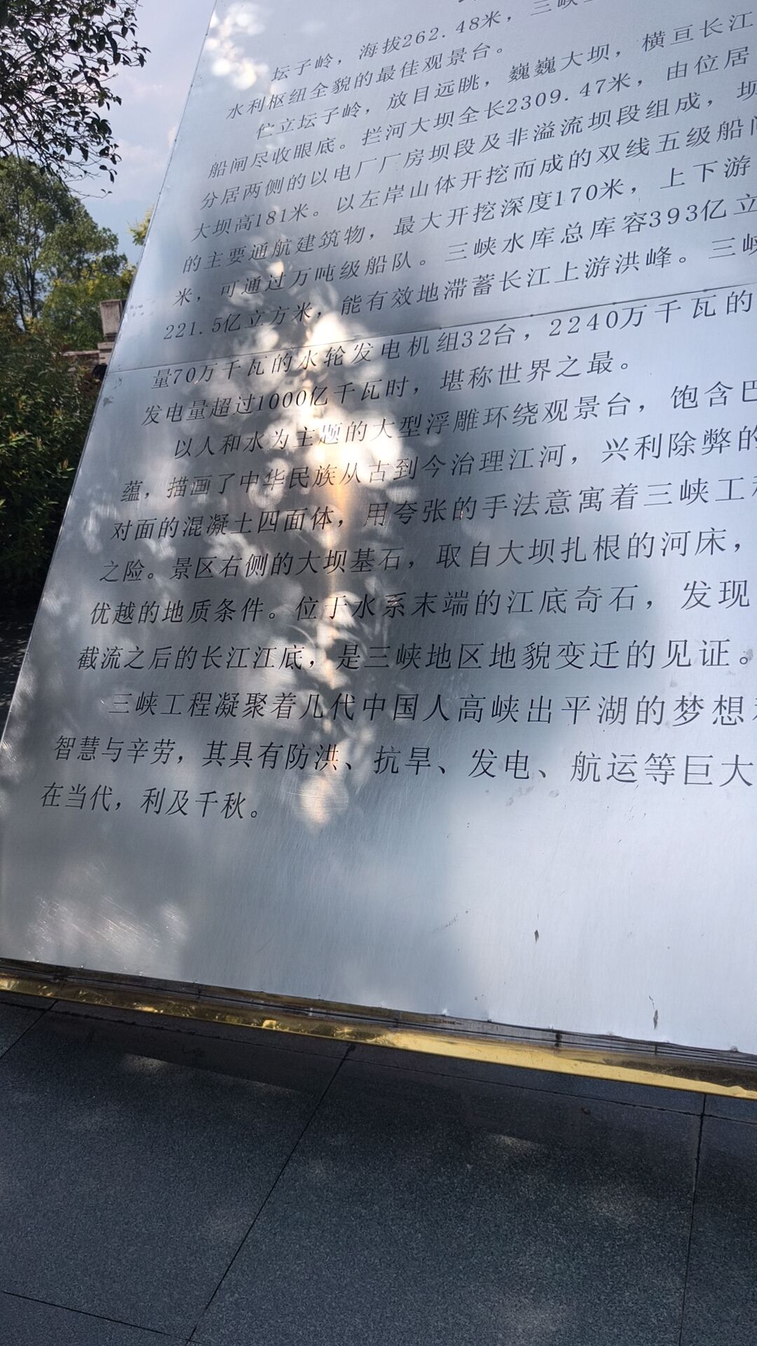 中午游船旅程结束下船,吃了自助餐以后,上车正式开始三峡大坝之旅。今天本来天气预报是阴有中雨,结果就早上阴了一会儿,之后就阳光明媚,蓝天白云。太阳晒在皮肤上火辣辣的,清晰感受到了阳光的压力。今天感受到了秋老虎的厉害,汗出了一身有一身。还好有些内容是博物馆里,体验馆里,相对舒服很多。还是有不少人完成不了游览路线,受不住天气的炎热。