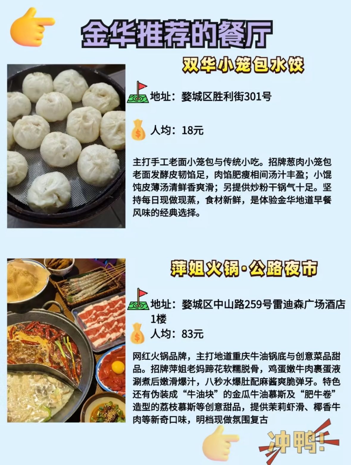 来金华,让味蕾先行,让美食成为你记忆中最美好的部分! #金华美食 #萍姐火锅 #婺家小菜 #盛武肥牛 #小女当家 #双华小笼包 #根松酒家