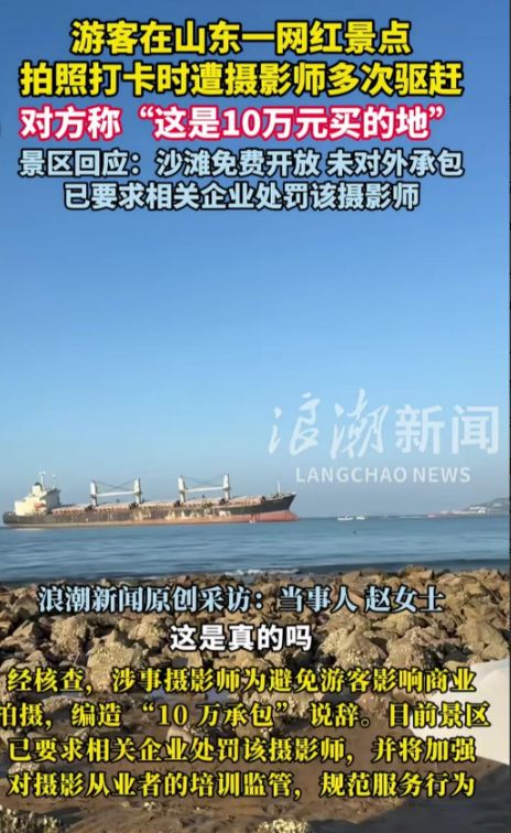 游客在山东威海布鲁斯沙滩拍照,遭摄影师多次驱赶,声称拍照区域是他们花10万元买的,景区回应,沙滩是免费开放的,没有外租,将对摄影师进行处罚!