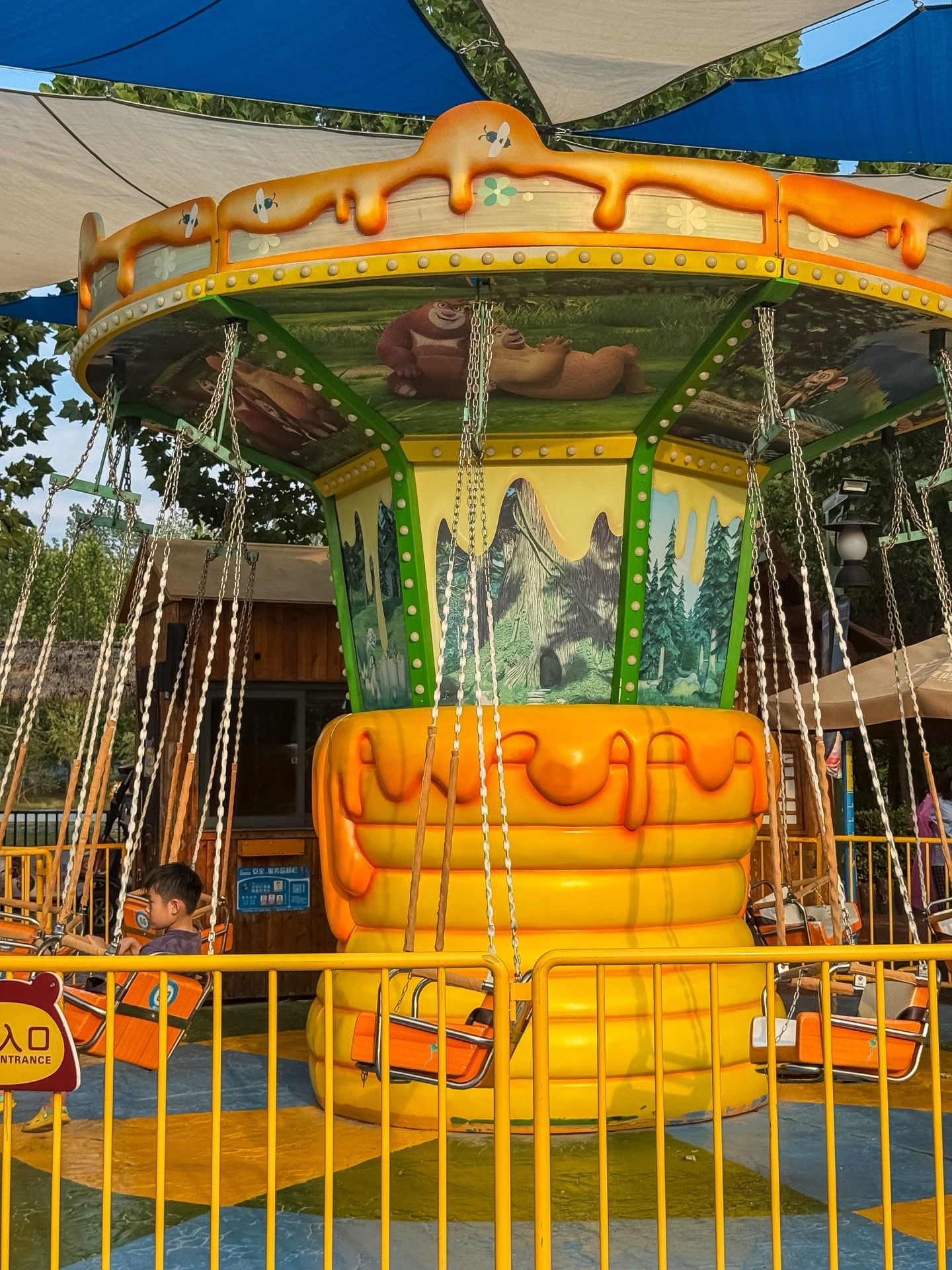 双层旋转木马:色彩鲜艳,缓慢旋转,宝宝能稳稳坐住,家长可陪同,拍照超出片。