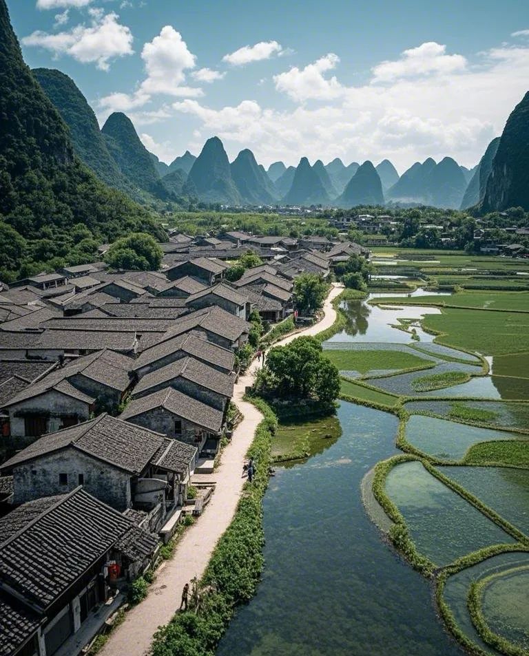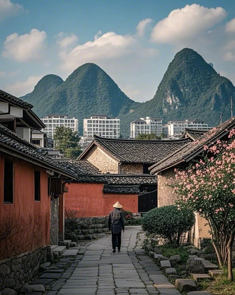 比阳朔更古朴的明清商贸码头!14座青砖老宅沿江而建,万寿桥下的浅滩可戏水捞螺,推荐在“熊村”段拍摄漓江渔火,感受未被商业化的慢时光。