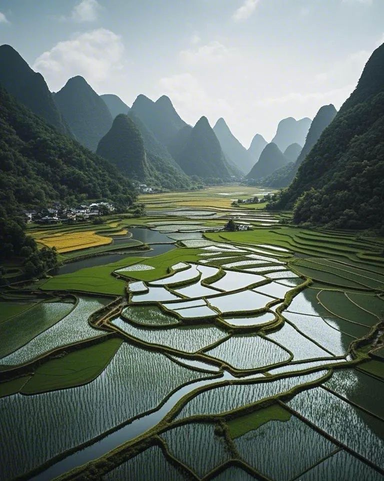 桂林版“天空之镜”!春种时节,灌水的梯田如碎裂的镜面倒映云天,登沐宦头村观景台(村民收费5元)可拍全景。顺路探访铜桥村的清代石拱桥,感受“小桥流水人家”的诗意。
