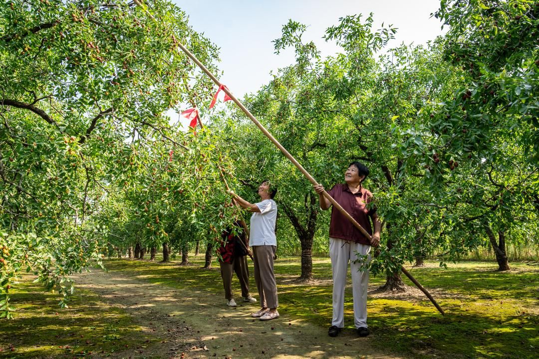 次日清晨,采风团赴枣博园,望海亭下骑行者、枣林间跑团与绿色枣林相映,勾勒 “生态乐陵” 活力。朱集镇千年枣林中,枣农打枣、游客采摘、老枣树下农民画教学的场景,既显千年枣文化底蕴,更绘乡村振兴新图景。