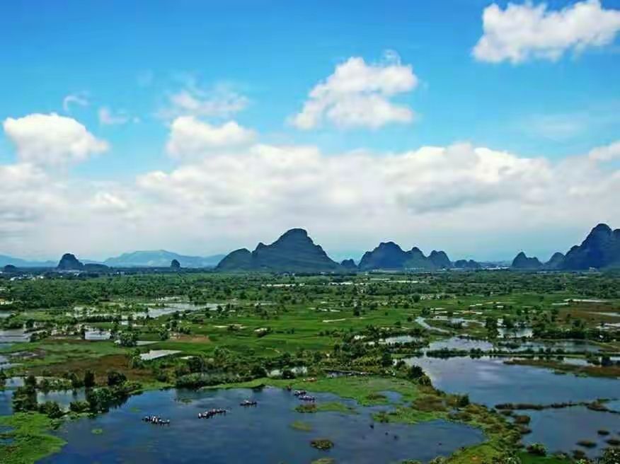 湿地最奇妙之处在于打破了四季的界限。东岸的喀斯特峰林刚刚披上春装,西坡的芦苇却已染上秋霜;北面的池塘里夏荷亭亭玉立,南边的草甸上还留着去冬的枯黄。老秦弯腰从水中捞起一丛水草,叶尖的露珠在阳光下晶莹剔透:"万物都有自己的时令,就像你与桂林的缘分,早在十年前就已注定。"