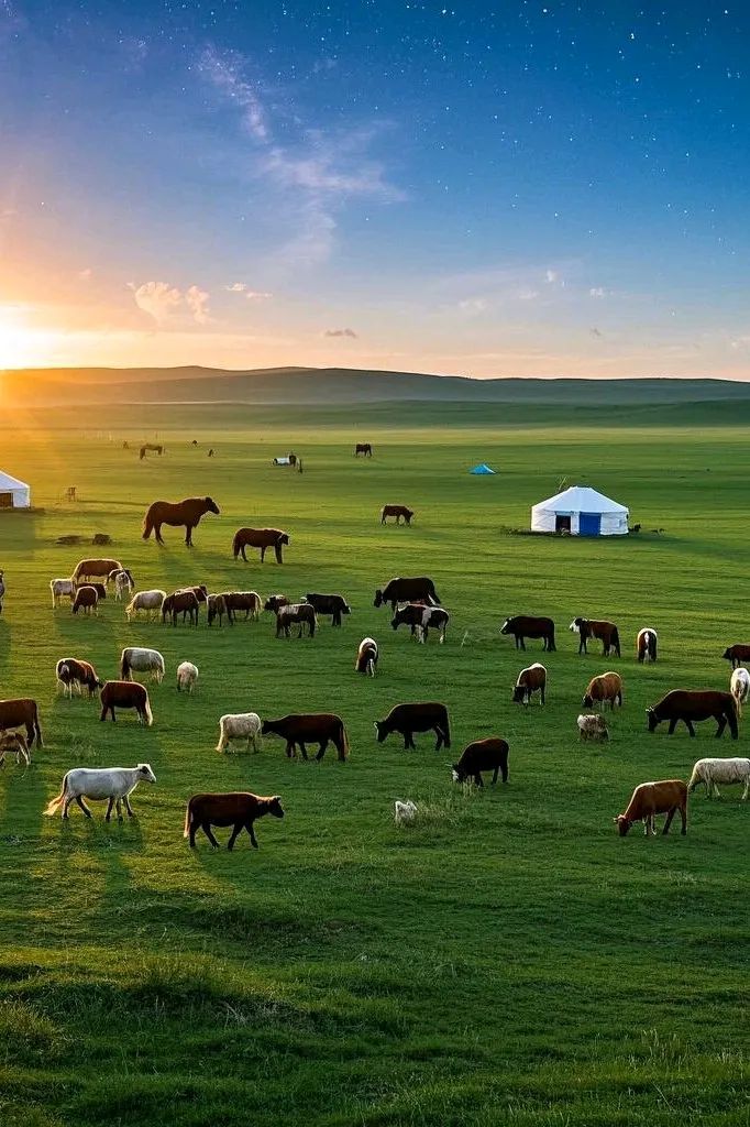 内蒙古呼伦贝尔:呼伦贝尔的天空像是被打翻的蓝色颜料,草原则是绿色的海洋,两者交织构成了人间最美的景色。在这里,你可以看到成群的牛羊在草原上悠闲地吃草,远处的骏马在奔驰。还可以参观蒙古族的部落,体验蒙古族的文化和生活。夜晚,躺在草原上,看着满天的繁星,感受着大自然的宁静与辽阔。