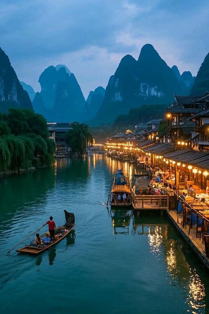 广西桂林:桂林山水甲天下,这里的山水景色如诗如画。漓江的水清澈见底,两岸的山峰形态各异,有的像骆驼,有的像大象,倒映在水中,仿佛一幅美丽的山水画卷。你可以选择乘坐竹筏顺流而下,感受江水的清凉,欣赏沿途的美景。阳朔的西街也是不可错过的地方,这里充满了文艺气息,夜晚灯火辉煌,热闹非凡,可以品尝当地的美食,购买特色的纪念品。