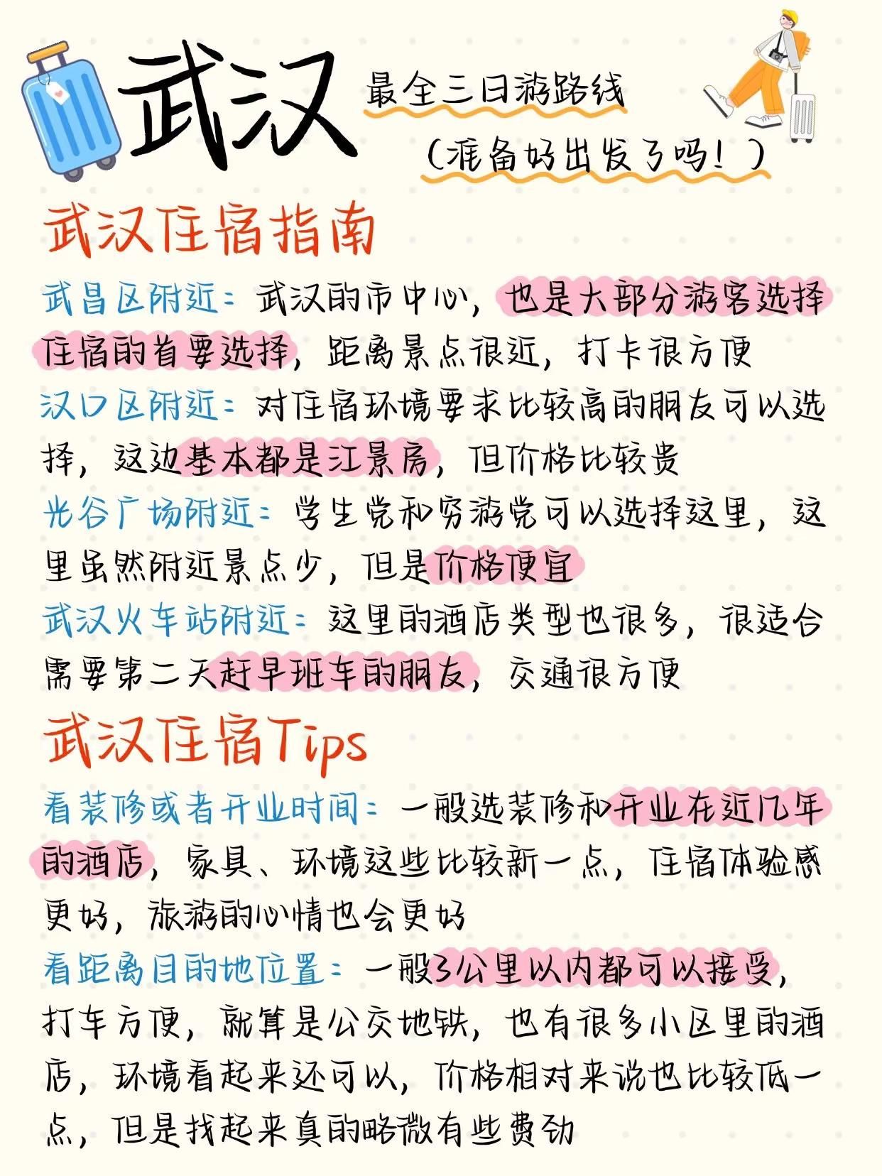 本地人手写的武汉三日游攻略快快收藏好。来到武汉真的不想走,主要是因为这里有好多好吃的美食和好看的景点,不过还是建议国庆来的姐妹们提前做好攻略再出发,不然很容易踩坑-武汉游玩建议看巴公房子得赶早,不然人多到你根本没心情拍照,很难拍出满意的照片景区里热情且主动和你合照的卡通人物扮演者不要理会,拍完就会找你收费湖北博物馆就在东湖旁边,可以同一天去,逛完博物馆就去东湖骑车,骑单车游玩很惬意文艺小资的黎黄陂路还是很出片的,但是没准备消费的话不要轻易坐人家店里轮渡建议晚上去坐,适合看夜景,但是要注意时间,晚上20点收班了,尽量早点过去-武汉住宿指南武昌区附近:武汉的市中心,也是大部分游客选择住宿的首要选择,距离景点很近,打卡很方便汉口区附近:对住宿环境要求比较高的朋友可以选择,这边基本都是江景房,但价格比较贵光谷广场附近:学生党和穷游党可以选择这里,这里虽然附近景点少,但是价格便宜武汉火车站附近:这里的酒店类型也很多,很适合需要第二天赶早班车的朋友,交通很方便-武汉市内出行地铁:票价在2-7元之间,价格很良心,可以到达大部分热门景点,建议出行shou选公交车:票价2元,武汉的公交车司机在全国都很出名,想体验现实版速度与激情的可以尝试坐一下出租车:司机打表计费,一般不会出现宰客的现象,但是高峰期会堵车网约车:认准正规平台xia单,应答速度很快#武汉 #旅游 #武汉美食 #旅游攻略 #武汉旅游攻略