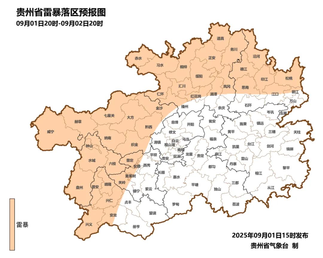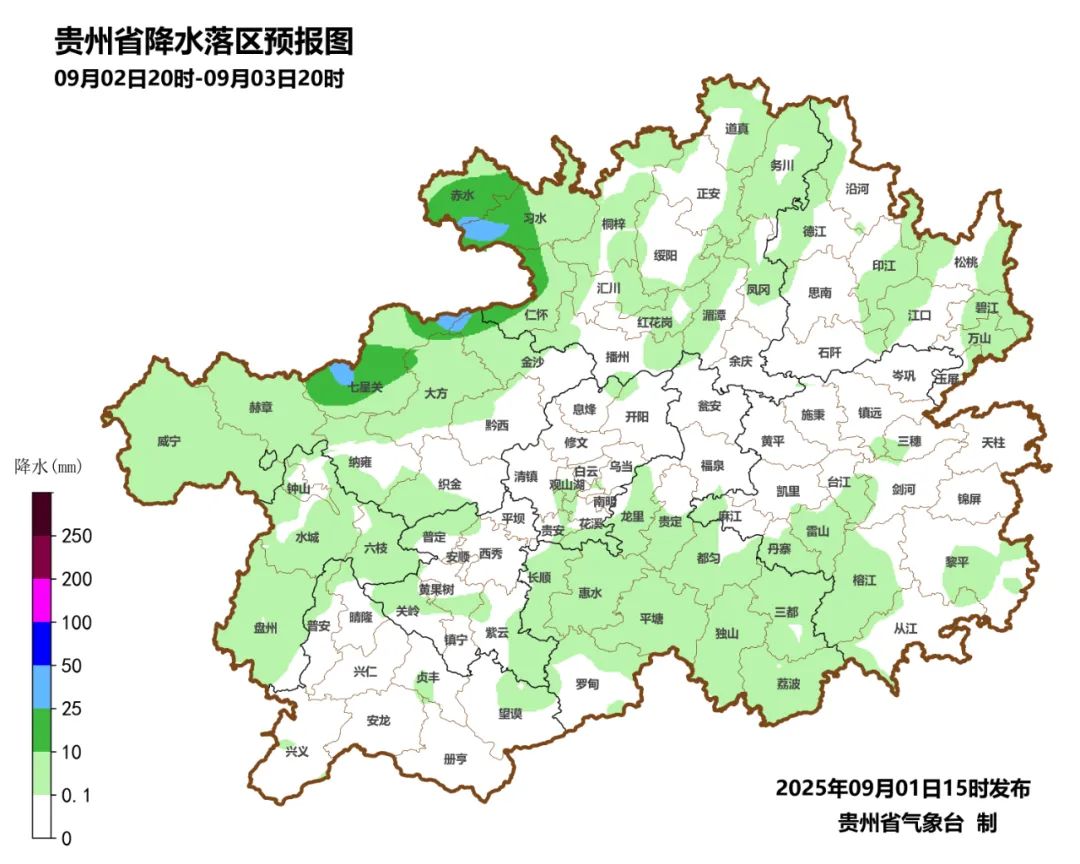 31日08时至9月1日08时,暴雨出现在铜仁市的江口1县域内的1个观测站(乡镇最大为江口县坝盘镇头坝溪54.2毫米),大雨有14个观测站,中雨有58个观测站,小雨有642个观测站。有10个县(铜仁市的江口、沿河、碧江,黔东南州的岑巩、镇远,黔西南州的兴义、兴仁、册亨、安龙、普安)15站次出现短时强降水,小时雨强最大为江口县坝盘镇头坝溪48.6毫米(2025-08-31 14:00)。
