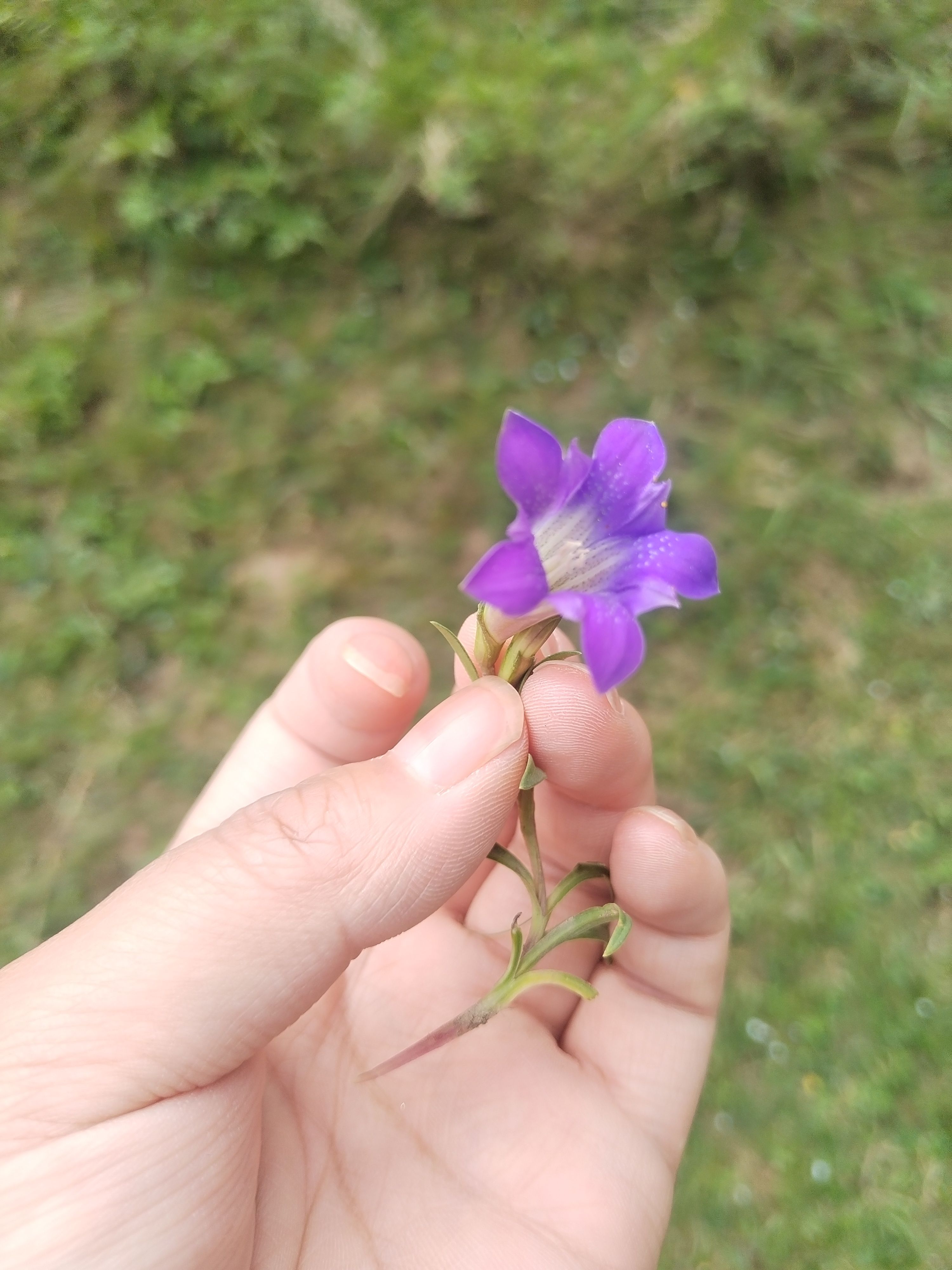 在瀑布周边的草地上,秋日的野花正肆意铺展。最令人惊艳的是龙胆花,那抹浓郁的紫色在草丛中格外醒目。五片花瓣组成的花冠呈钟形,花瓣上还点缀着细碎的白点,像把高原的星光揉进了花盏里。它们或三两株挤在岩石缝中,或一片一片铺满缓坡,在秋日的阳光下泛着丝绒般的光泽。当地牧民说,龙胆花是高原的“蓝色精灵”,能从九月一直开到初雪降临,在萧瑟的秋意里倔强地绽放着生机。