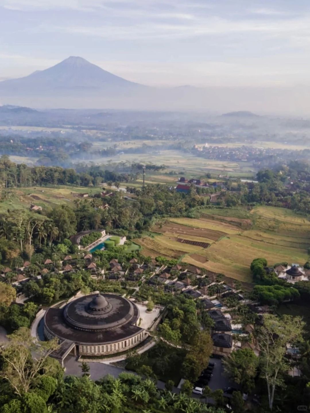 酒店落址于 Central Java 马格朗婆罗浮屠 Majaksingi 村,推窗即见婆罗浮屠的阶梯金字塔轮廓—— 那是 8 世纪夏连特拉王朝的杰作,曾因火山爆发沉睡百年,19 世纪重见天日、20 世纪修复新生,如今仍以密宗曼荼罗布局,用塔基、塔身、塔顶三层结构,承载佛教 “戒、定、慧” 的修行境界。