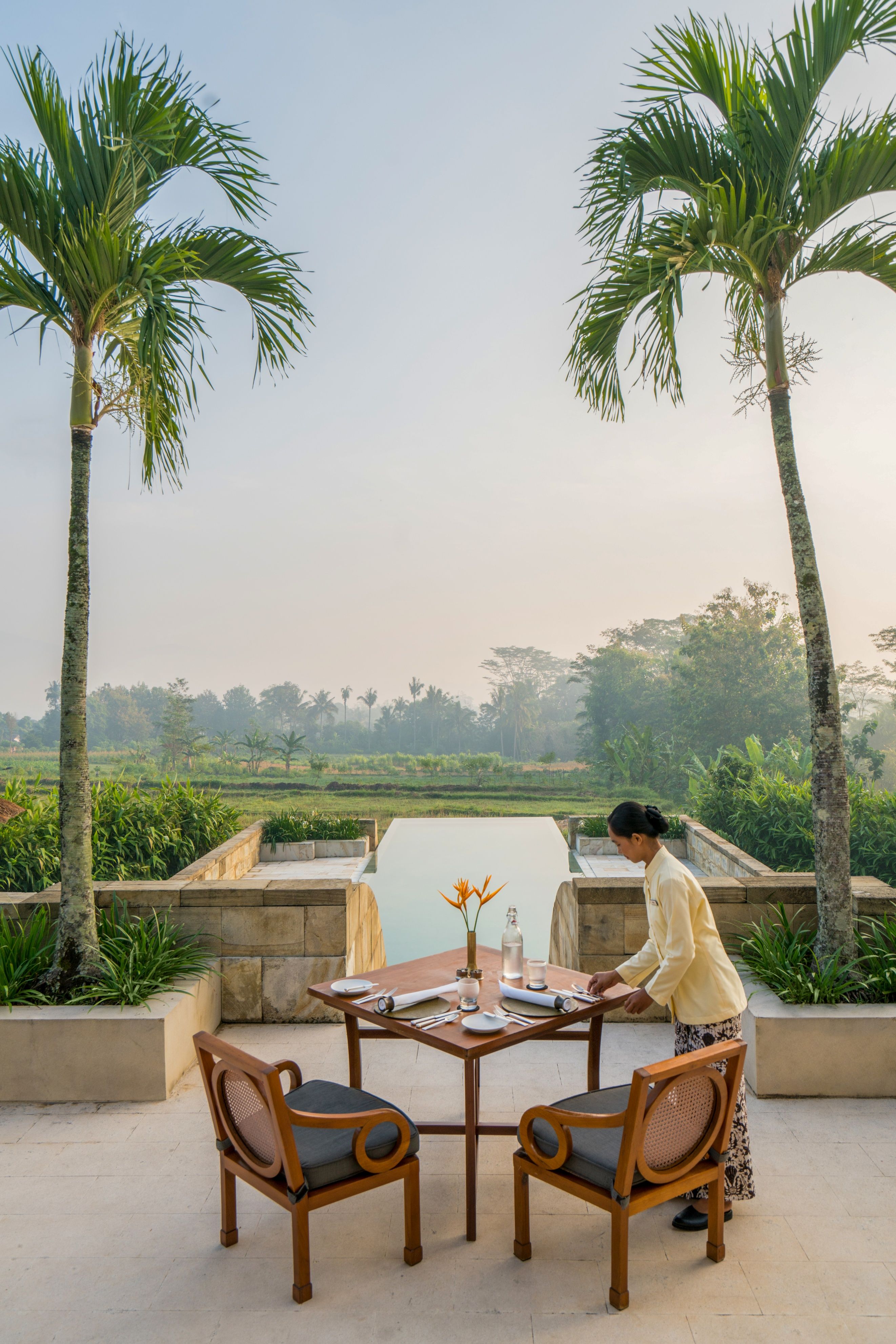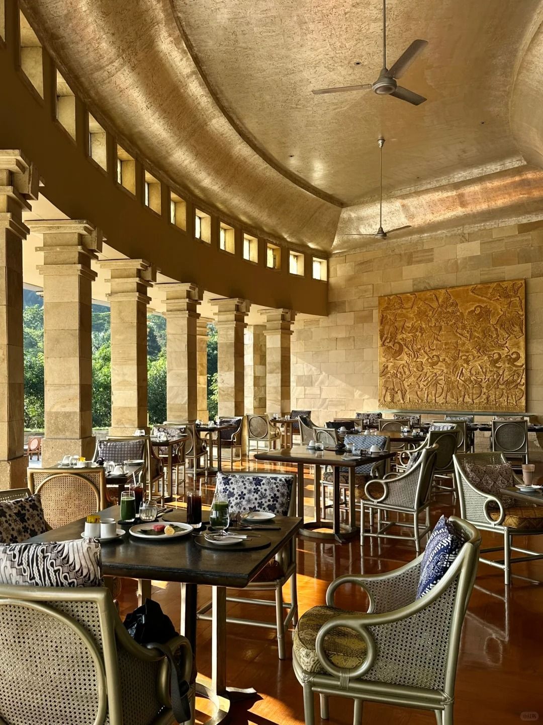 走进套房,每一处细节都是爪哇传统的当代演绎:穹顶或茅草屋顶滤进柔和天光,珊瑚米黄色石灰石墙面带着大地温度,水磨石地板映着木屏风的纹路;四柱床铺着日惹蜡染布艺,椰木藤编家具缀着玻璃画,更有下沉式户外浴缸,让你在泡澡时仍能望见远处的火山与稻田。最妙是弯月形 Joglo Sawah 餐厅,大尺度石柱打破室内外边界,用餐时仿佛与千年古寺、田园风光融为一体。
