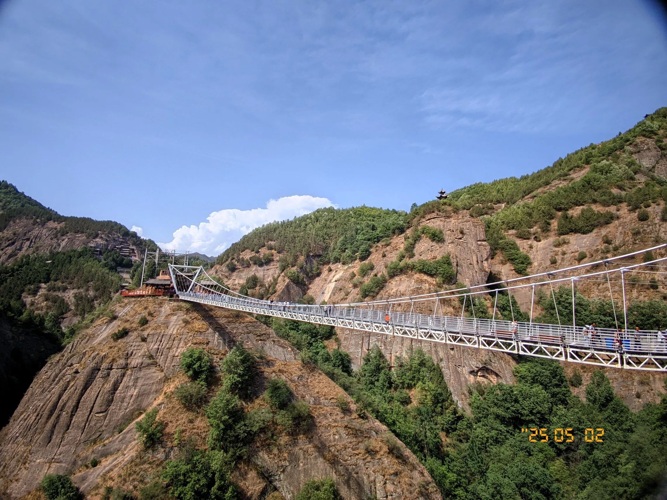 接着便来到了悬空索桥,桥长260米,宽3米,悬空建设于两山之间,气势恢宏。走在桥上,桥随着脚步轻轻晃动,每走一步都感觉晃晃悠悠的,尤其是走到中间时,晃动更加明显,让人胆战心惊。但桥下的美景又让人忍不住驻足欣赏,远处的山峰在蓝天白云的映衬下显得格外壮观,山间的云雾时而升腾,时而飘散,宛如仙境一般。