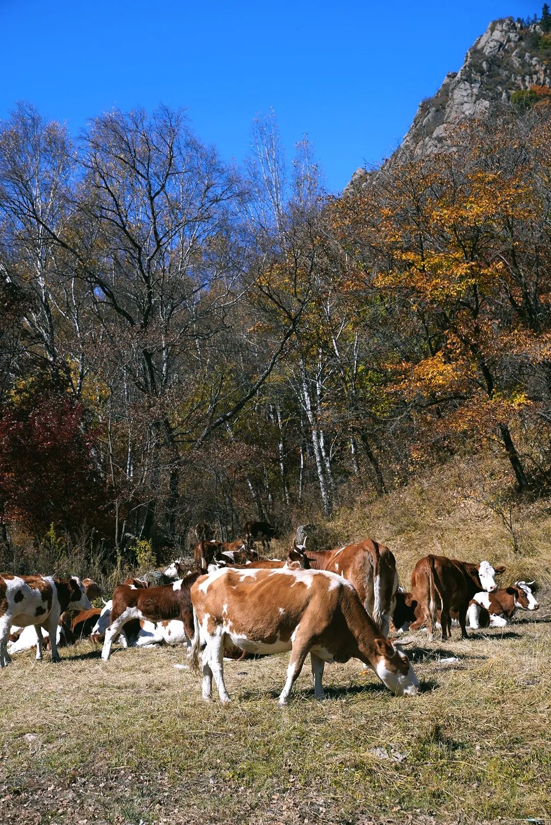 进入五道沟风景区(终点出来就可以上国家一号风景大道),一路上两边风景很美,盘旋而上,有好看的随停,有瀑布、牛羊、成片的彩叶林(云杉、五角枫、蒙古烁、针阔混交林;白桦树叶子有点秃了,但是还是很好看);每拐一个弯都是惊喜!落叶在风中掉落,满地金黄~蓝天白云,秋光正好,一幅多姿多彩的油画!
