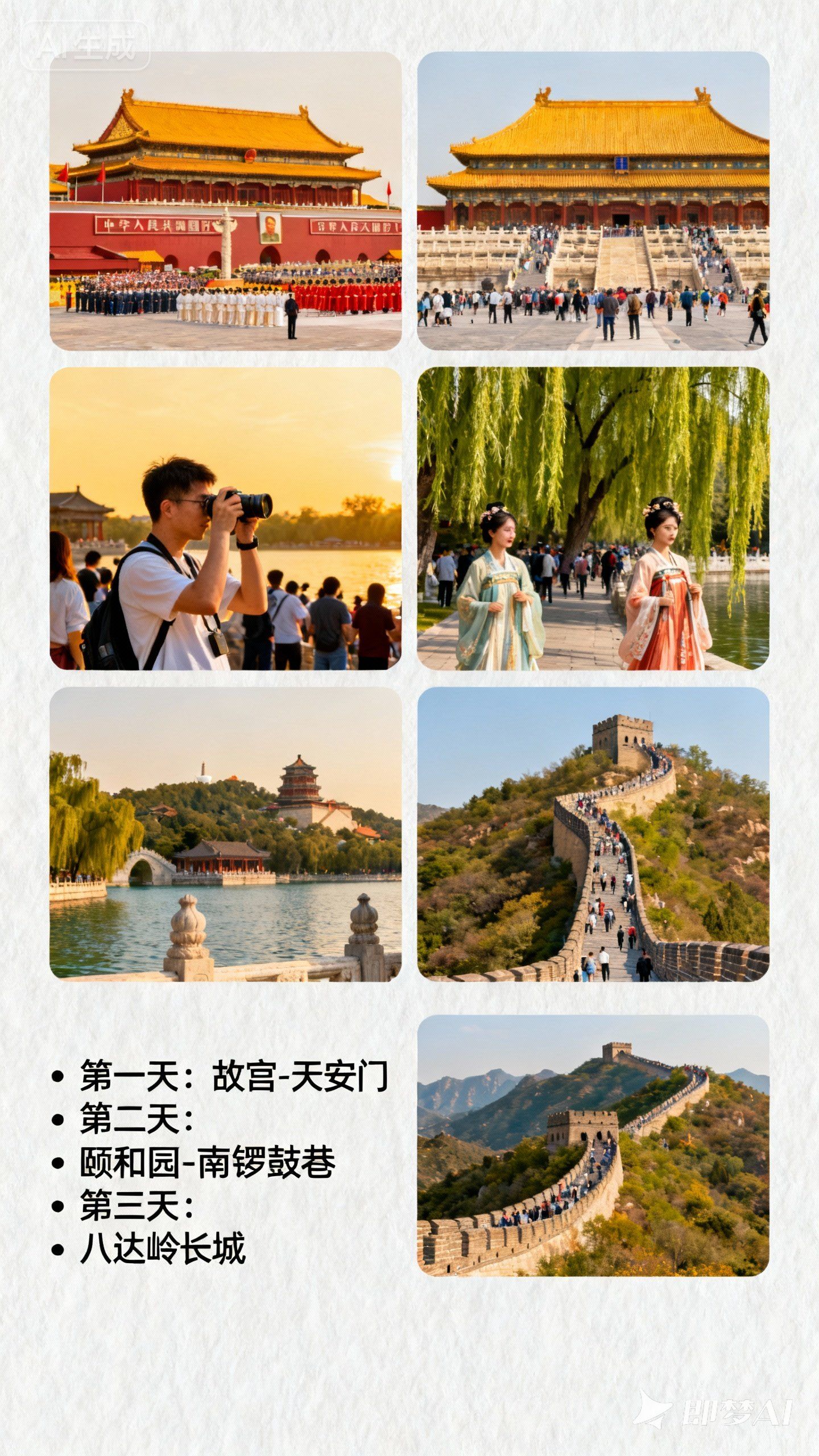 北京三日游可以兼顾历史文化、地标打卡和城市风情,以下是经典路线推荐,供你参考:
