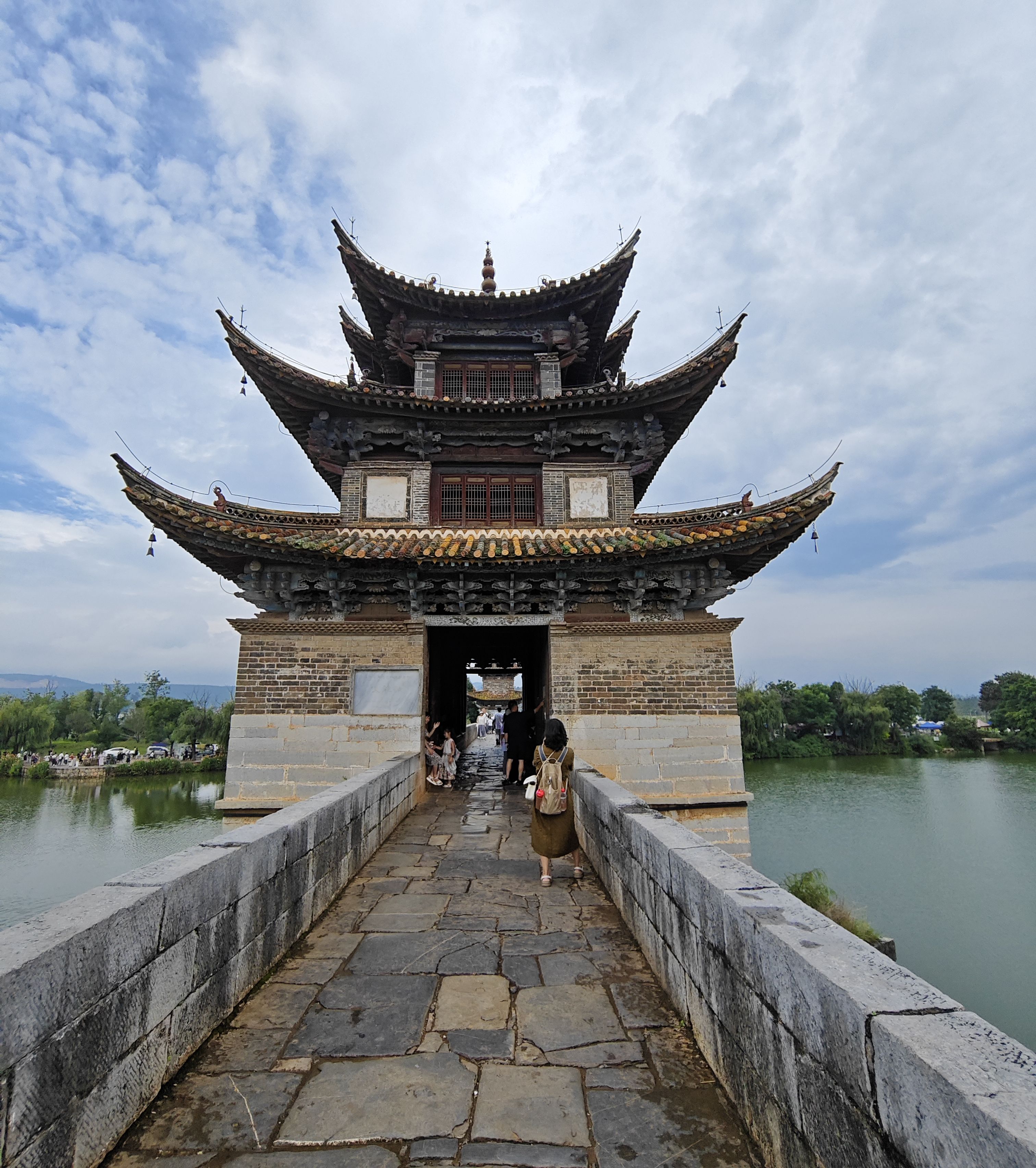最后去了双龙挢,没有让我失望。十七孔的石拱桥横卧江上,桥上的两桥古城楼苍劲壮观,我感到了震撼(图十六、十七、十八)。在桥上走了一圈,拍了照还出镜摄了像。