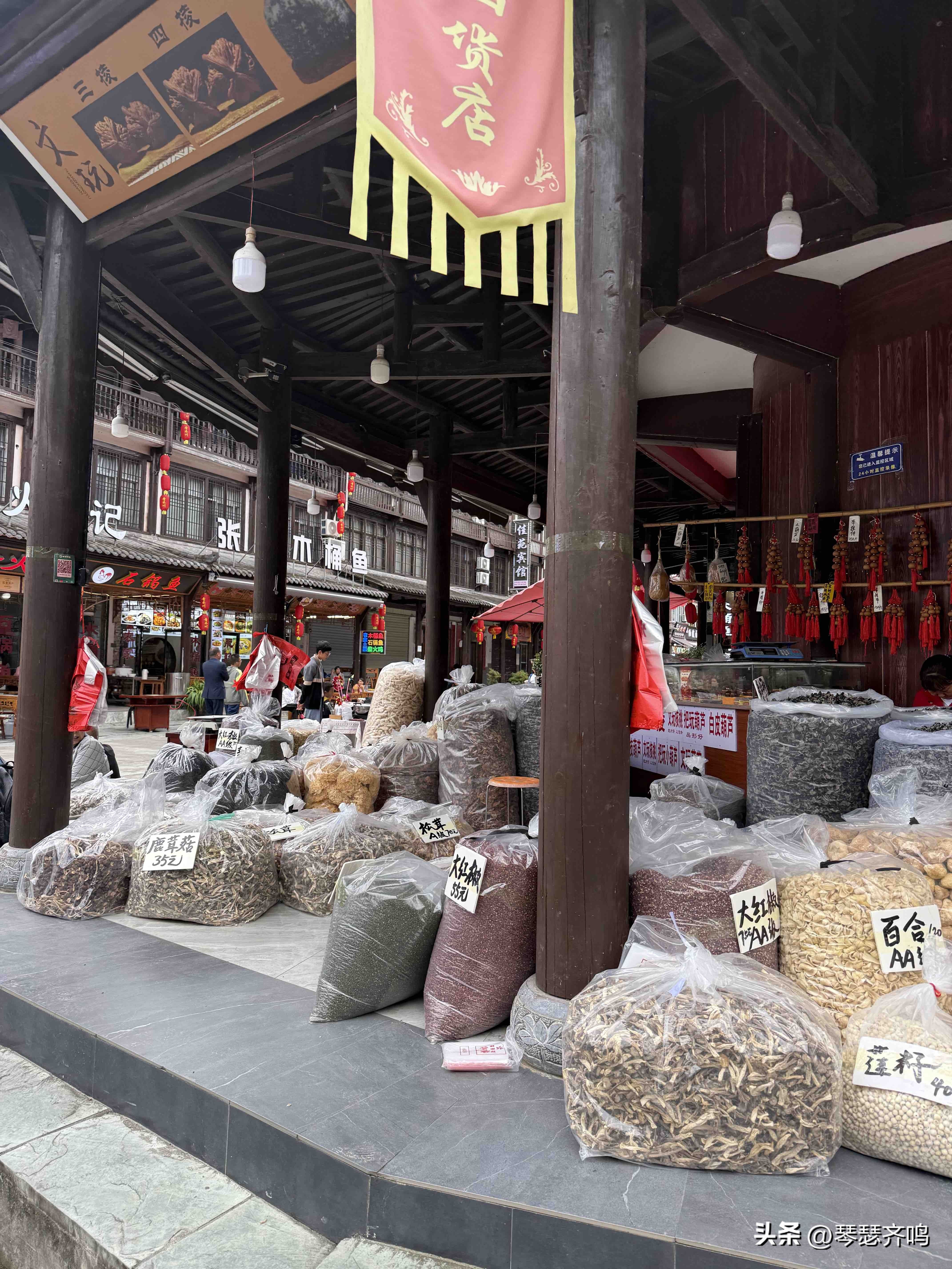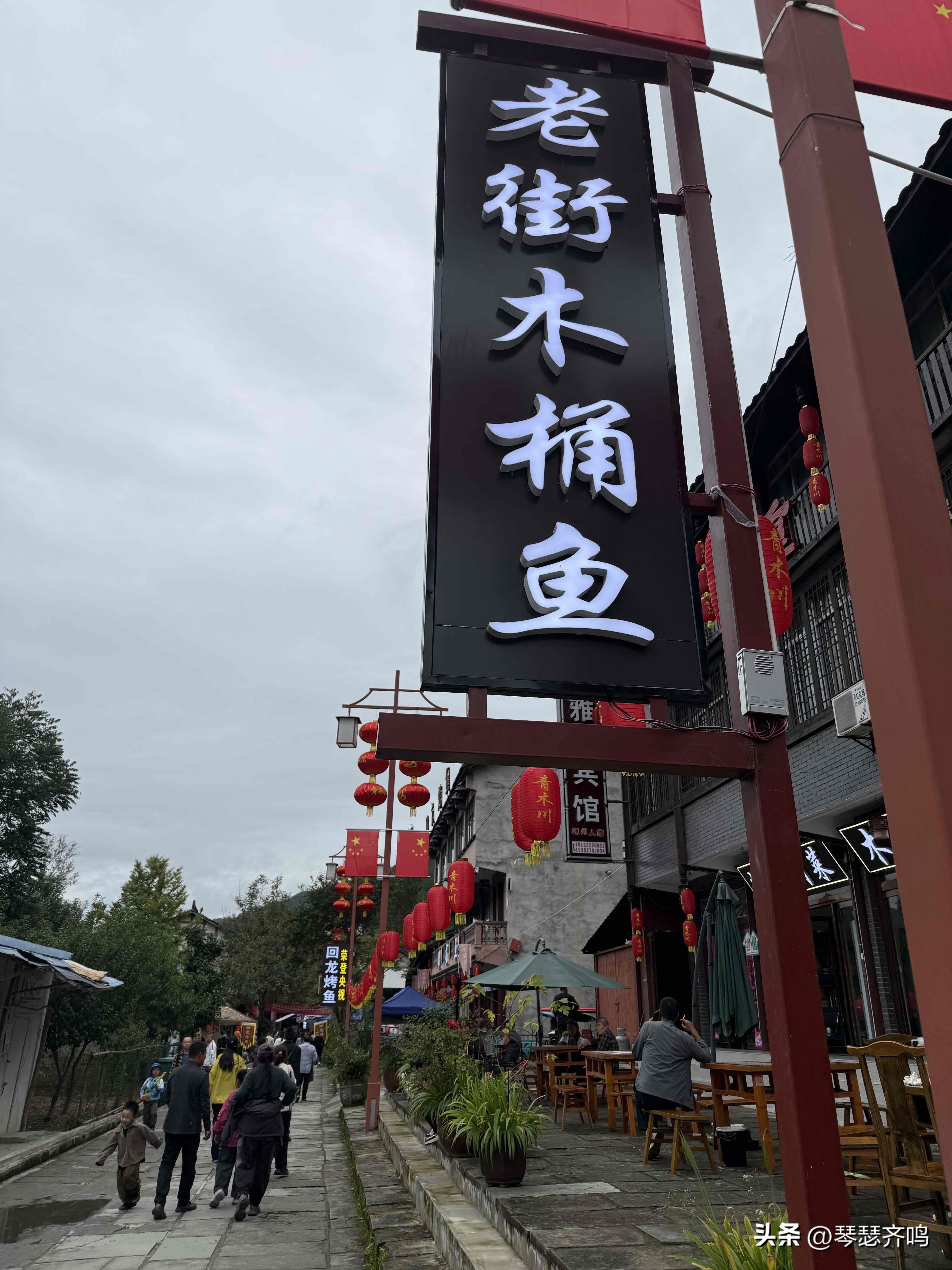 现在的古镇模样大致都差不多,有古朴的建筑,也有新型的模式;各类餐厅、民宿 商铺鳞次栉比,各种地方特产小吃摆满了街道两旁,我们到达时正值中午时分 ,个个餐厅的服务人员在路边拉客的比比皆是,叫卖声此起彼伏,好不热闹。最为醒目的招牌就是木桶鱼、核桃饼、各种山珍:木耳、蘑菇、各种菌类等,还有一些竹编的手工艺品。游客熙熙攘攘,商铺生意火爆,商业气氛非常浓厚。