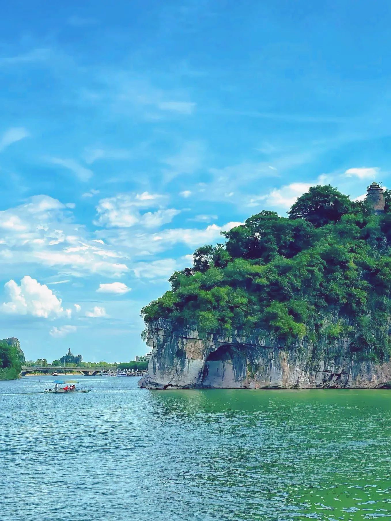 像一头在漓江畔饮水的大象,是万年地质雕琢出的天然雕塑。黄昏时分到訾洲公园远眺,晚霞为象鼻镀上一层金边,那水中倒影与实景虚实难辨,简直美爆了~