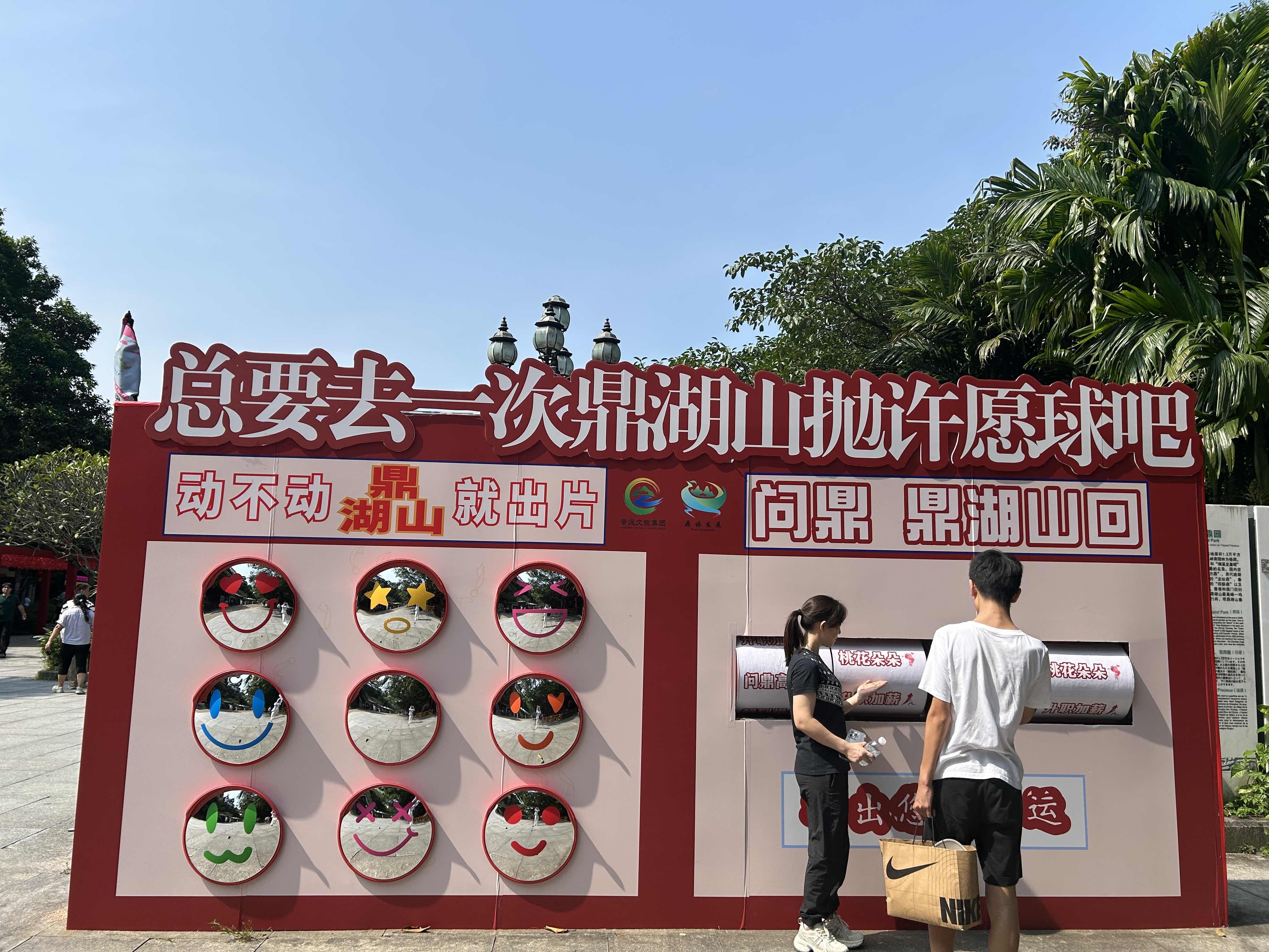 在鼎湖山宝鼎园,向“九龙宝鼎”投掷许愿球,寓意着“问鼎”“高中”,因为“鼎”与“顶”两字读音相近,有拔得头筹、取得优异成绩之意,所以很多学生和家长在考试季会前来抛许愿球,祈求学业进步、金榜题名。此外,还有说法认为,只要将许愿球抛进鼎内,那么许的愿望就都能实现。